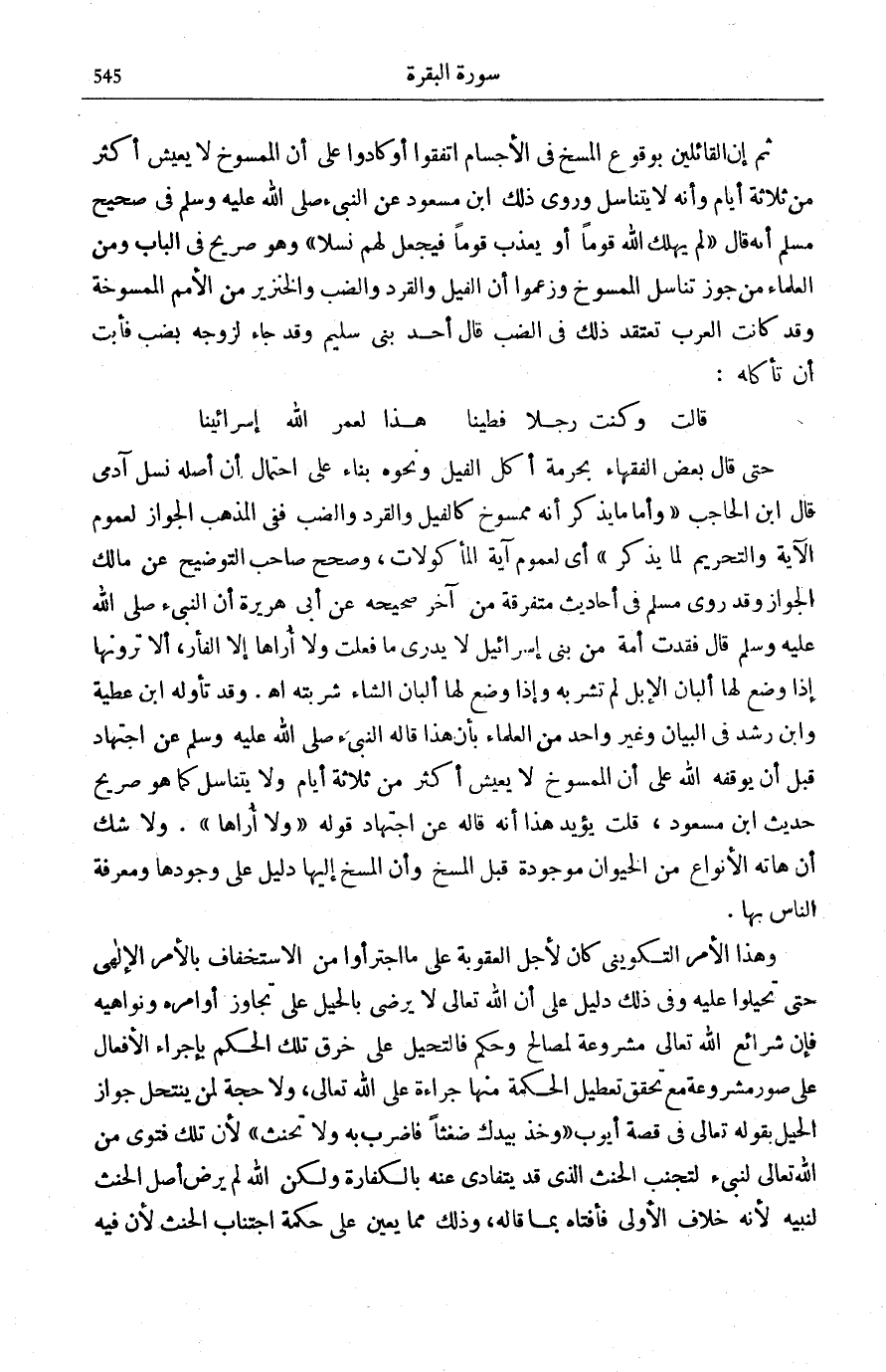 وَهُوَ صَرِيحٌ فِي الْبَابِ وَمِنَ الْعُلَمَاءِ مِنْ جَوَّزَ تَنَاسُلَ الْمَمْسُوخِ وَزَعَمُوا أَنَّ الْفِيلَ وَالْقِرْدَ وَالضَّبَّ وَالْخِنْزِيرَ مِنَ الْأُمَمِ الْمَمْسُوخَةِ وَقَدْ كَانَتِ الْعَرَبُ تَعْتَقِدُ ذَلِكَ فِي الضَّبِّ قَالَ أَحَدُ بَنِي سُلَيْمٍ وَقَدْ جَاءَ لِزَوْجِهِ بِضَبٍّ فَأَبَتْ أَنْ تَأْكُلَهُ: