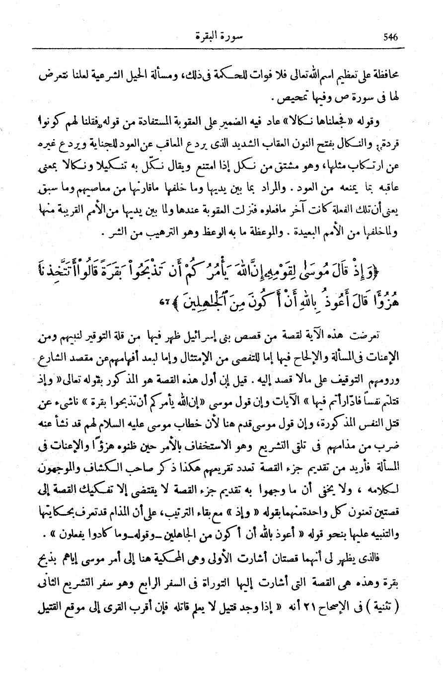 الشَّارِعِ وَرَوْمِهِمُ التَّوْقِيفَ عَلَى مَا لَا قَصْدَ إِلَيْهِ. قِيلَ: إِنَّ أَوَّلَ هَذِهِ الْقِصَّةِ هُوَ الْمَذْكُورُ بِقَوْلِهِ تَعَالَى: وَإِذْ قَتَلْتُمْ نَفْساً فَادَّارَأْتُمْ فِيها [الْبَقَرَة: 72] الْآيَة وَإِنَّ قَوْلَ مُوسَى: إِنَّ اللَّهَ يَأْمُرُكُمْ أَنْ تَذْبَحُوا بَقَرَةً نَاشِيءٌ عَنْ قَتْلِ النَّفْسِ الْمَذْكُورَةِ، وَإِنَّ قَوْلَ مُوسَى قُدِّمَ هُنَا لِأَنَّ خِطَابَ مُوسَى عَلَيْهِ السَّلَامُ لَهُمْ قَدْ نَشَأَ عَنْهُ ضَرْبٌ مِنْ مَذَامِّهِمْ فِي تَلَقِّي التَّشْرِيعِ وَهُوَ الِاسْتِخْفَافُ بِالْأَمْرِ حِينَ ظَنُّوهُ هُزُؤًا وَالْإِعْنَاتُ فِي الْمَسْأَلَةِ فَأُرِيدَ مِنْ تَقْدِيمِ جُزْءِ الْقِصَّةِ تَعَدُّدُ تَقْرِيعِهِمْ، هَكَذَا ذَكَرَ صَاحِبُ «الْكَشَّافِ» وَالْمُوَجِّهُونَ لِكَلَامِهِ، وَلَا يَخْفَى أَنَّ مَا وَجَّهُوا بِهِ تَقْدِيمَ جُزْءِ الْقِصَّةِ لَا يَقْتَضِي إِلَّا تَفْكِيكَ الْقِصَّةِ إِلَى قِصَّتَيْنِ تُعَنْوَنُ كُلُّ وَاحِدَةٍ مِنْهُمَا بِقَوْلِهِ: وَإِذْ مَعَ بَقَاءِ التَّرْتِيبِ، عَلَى أَنِ الْمَذَامَّ قَدْ تُعْرَفُ بِحِكَايَتِهَا وَالتَّنْبِيهِ عَلَيْهَا بِنَحْوِ قَوْلِهِ: أَعُوذُ بِاللَّهِ أَنْ أَكُونَ مِنَ الْجاهِلِينَ وَقَوْلِهِ: وَما كادُوا يَفْعَلُونَ [الْبَقَرَة: 71] .