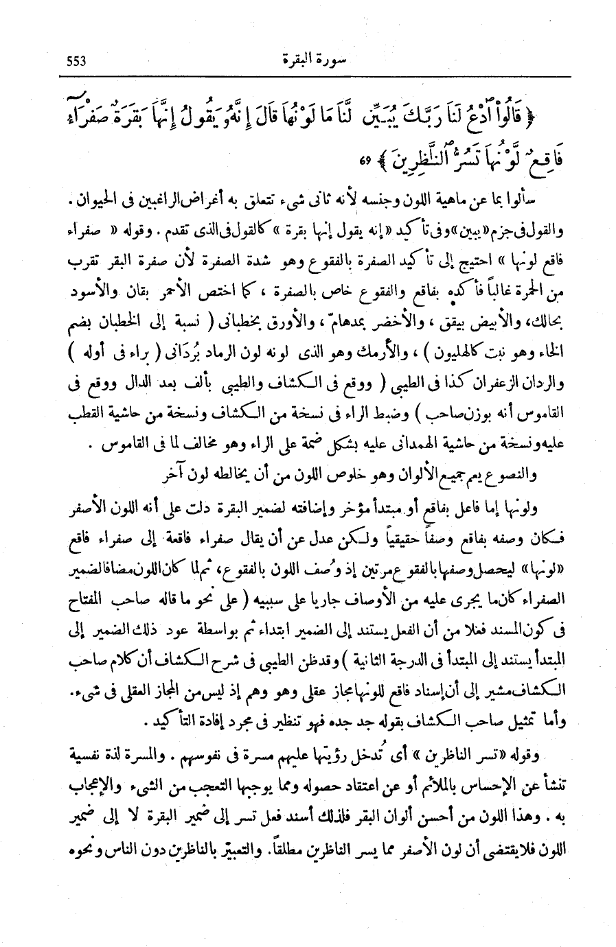 وَقَوْلُهُ: صَفْراءُ فاقِعٌ لَوْنُها احْتِيجَ إِلَى تَأْكِيدِ الصُّفْرَةِ بِالْفُقُوعِ وَهُوَ شِدَّةُ الصُّفْرَةِ لِأَنَّ صُفْرَةَ الْبَقَرِ تُقَرِّبُ مِنَ الْحُمْرَةِ غَالِبًا فَأَكَّدَهُ بِفَاقِعٍ وَالْفُقُوعُ خَاصٌّ بِالصُّفْرَةِ، كَمَا اخْتَصَّ الْأَحْمَرُ بِقَانٍ وَالْأَسْوَدُ بِحَالِكٍ، وَالْأَبْيَضُ بَيْقَقٌ، وَالْأَخْضَرُ بِمُدْهَامٍّ، وَالْأَوْرَقُ بِخُطْبَانِيٍّ (نِسْبَةً إِلَى الْخُطْبَانِ بِضَمِّ الْخَاءِ وَهُوَ نَبْتٌ كَالْهِلْيُونِ) ، وَالْأُرْمَكُ وَهُوَ الَّذِي لَوْنُهُ لَوْنُ الرَّمَادِ بِرَدَّانِيٍّ (بَرَاءٍ فِي أَوَّلِهِ) وَالرَّدَّانُ الزَّعْفَرَانُ كَذَا فِي الطِّيبِيِّ (وَوَقَعَ فِي «الْكَشَّاف» و «الطَّيِّبِيّ» بِأَلِفٍ بَعْدَ الدَّالِ وَوَقَعَ فِي «الْقَامُوسِ» أَنَّهُ بِوَزْنِ صَاحِبٍ) وَضَبْطِ الرَّاءِ فِي نُسْخَةٍ مِنَ «الْكَشَّافِ» وَنُسْخَةٍ مِنْ «حَاشِيَةِ الْقُطْبِ» عَلَيْهِ وَنُسْخَةٍ مِنْ «حَاشِيَةِ الْهَمْدَانِيِّ» عَلَيْهِ بِشَكْلِ ضَمَّةٍ عَلَى الرَّاءِ وَهُوَ مُخَالِفٌ لِمَا فِي «الْقَامُوسِ» .
