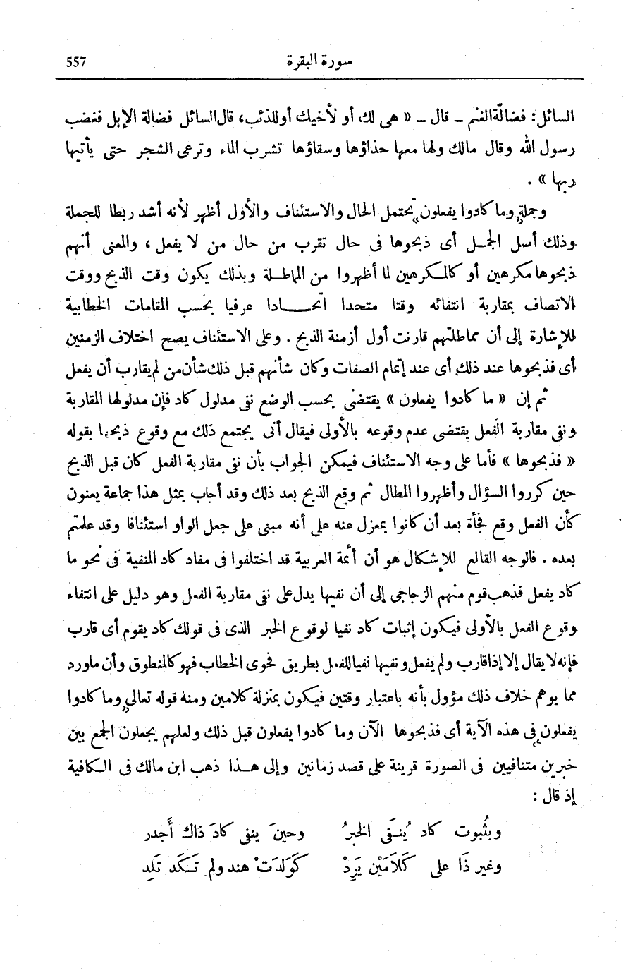 ثُمَّ إِنَّ مَا كادُوا يَفْعَلُونَ يَقْتَضِي بِحَسَبِ الْوَضْعِ نَفْيَ مَدْلُولِ كَادَ فَإِنَّ مَدْلُولَهَا الْمُقَارَبَةُ وَنَفْيُ مُقَارَبَةِ الْفِعْلِ يَقْتَضِي عَدَمَ وُقُوعِهِ بِالْأَوْلَى فَيُقَالُ أَنَّى يَجْتَمِعُ ذَلِكَ مَعَ وُقُوعِ ذَبْحِهَا بِقَوْلِهِ: فَذَبَحُوها؟ فَأَمَّا عَلَى وَجْهِ الِاسْتِئْنَافِ فَيُمْكِنُ الْجَوَابُ بِأَنَّ نَفْيَ مُقَارَبَةِ الْفِعْلِ كَانَ قَبْلَ الذَّبْحِ حِينَ كَرَّرُوا السُّؤَالَ وَأَظْهَرُوا الْمِطَالَ ثُمَّ وَقَعَ الذَّبْحُ بَعْدَ ذَلِكَ، وَقَدْ أَجَابَ بِمِثْلِ هَذَا جَمَاعَةٌ يَعْنُونَ كَأَنَّ الْفِعْلَ وَقَعَ فَجْأَةً بَعْدَ أَنْ كَانُوا بِمَعْزِلٍ عَنْهُ عَلَى أَنَّهُ مَبْنِيٌّ عَلَى جَعْلِ الْوَاوِ اسْتِئْنَافًا وَقَدْ عَلِمْتُمْ بُعْدَهُ.
