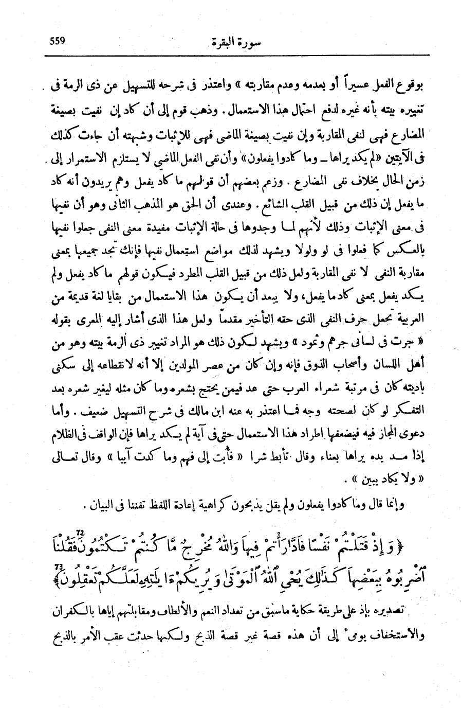 لِصِحَّتِهِ وَجْهٌ فَمَا اعْتَذَرَ بِهِ عَنْهُ ابْنُ مَالِكٍ فِي «شَرْحِ التَّسْهِيلِ» ضَعِيفٌ. وَأَمَّا دَعْوَى الْمَجَازِ فِيهِ فَيُضَعِّفُهَا اطِّرَادُ هَذَا الِاسْتِعْمَالِ حَتَّى فِي آيَةِ لَمْ يَكَدْ يَراها فَإِنَّ الْوَاقِفَ فِي الظَّلَامِ إِذَا مَدَّ يَدَهُ يَرَاهَا بِعَنَاءٍ وَقَالَ تَأَبَّطَ شَرًّا «فَأُبْتُ إِلَى فَهْمٍ وَمَا كدت آئبا» وَقَالَ تَعَالَى: وَلا يَكادُ يُبِينُ [الزخرف: 52] . وَإِنَّمَا قَالَ: وَما كادُوا يَفْعَلُونَ وَلَمْ يَقُلْ يَذْبَحُونَ كَرَاهِيَةَ إِعَادَةِ اللَّفْظِ تَفَنُّنًا فِي الْبَيَان.
