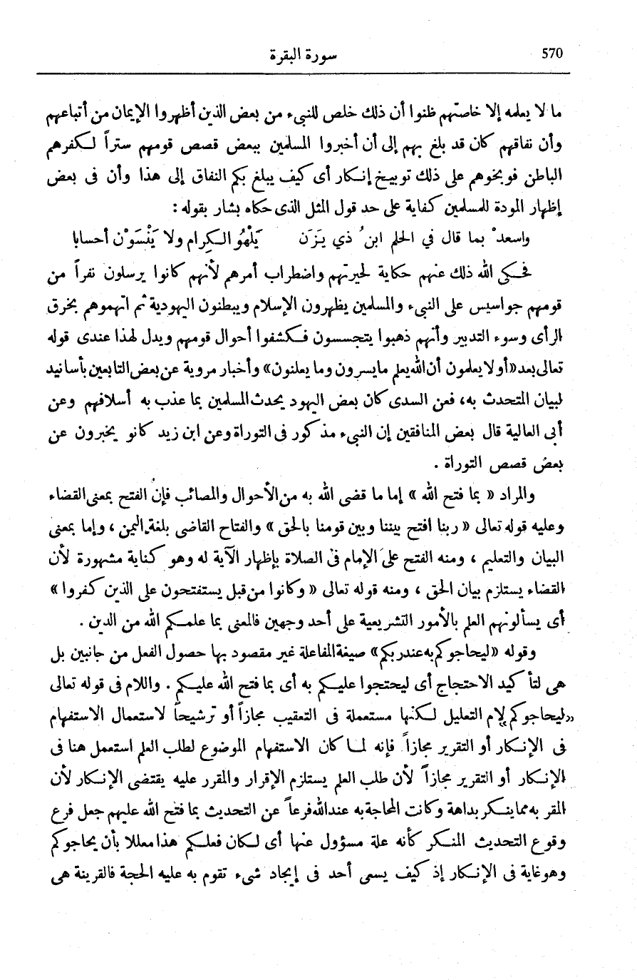 فَحَكَى اللَّهُ ذَلِكَ عَنْهُمْ حِكَايَةً لِحَيْرَتِهِمْ وَاضْطِرَابِ أَمْرِهِمْ لِأَنَّهُمْ كَانُوا يُرْسِلُونَ نَفَرًا مِنْ قَوْمِهِمْ جَوَاسِيسَ عَلَى النَّبِيءِ وَالْمُسْلِمِينَ يُظْهِرُونَ الْإِسْلَامَ وَيُبْطِنُونَ الْيَهُودِيَّةَ ثُمَّ اتَّهَمُوهُمْ بِخَرْقِ الرَّأْيِ وَسُوءِ التَّدْبِير وَأَنَّهُمْ دهبوا يَتَجَسَّسُونَ فَكَشَفُوا أَحْوَالَ قَوْمِهِمْ، وَيَدُلُّ لِهَذَا عِنْدِي قَوْلُهُ تَعَالَى بَعْدُ: أَوَلا يَعْلَمُونَ أَنَّ اللَّهَ يَعْلَمُ مَا يُسِرُّونَ وَما يُعْلِنُونَ وَأَخْبَارٌ مَرْوِيَّةٌ عَنْ بَعْضِ التَّابِعِينَ بِأَسَانِيدَ لِبَيَانِ الْمُتَحَدِّثِ بِهِ، فَعَنِ السُّدِّيِّ كَانَ بَعْضُ الْيَهُودِ يُحَدِّثُ الْمُسْلِمِينَ بِمَا عُذِّبَ بِهِ أَسْلَافُهُمْ، وَعَنْ أَبِي الْعَالِيَةِ قَالَ بَعْضُ الْمُنَافِقِينَ: إِنَّ النَّبِيءَ مَذْكُورٌ فِي التَّوْرَاةِ، وَعَنِ ابْنِ زَيْدٍ كَانُوا يُخْبِرُونَ عَنْ بَعْضِ قَصَصِ التَّوْرَاةِ.