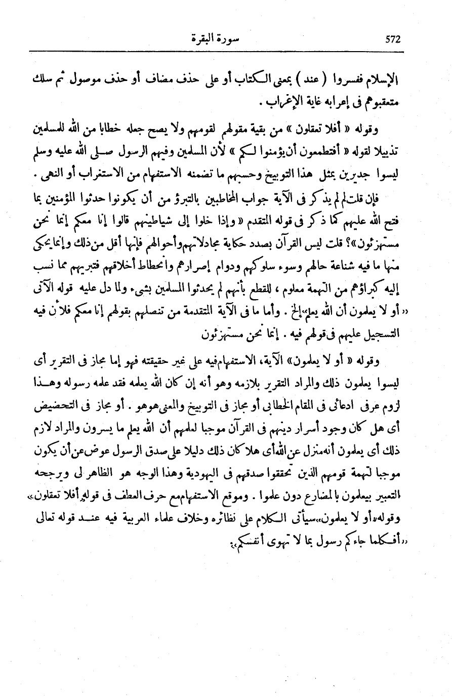 وَقَوْلُهُ: أَفَلا تَعْقِلُونَ مِنْ بَقِيَّةِ مَقُولِهِمْ لِقَوْمِهِمْ وَلَا يَصِحُّ جَعْلُهُ خِطَابًا مِنَ اللَّهِ لِلْمُسْلِمِينَ تَذْيِيلًا لِقَوْلِهِ: أَفَتَطْمَعُونَ أَنْ يُؤْمِنُوا لَكُمْ [الْبَقَرَة: 75] لِأَنَّ الْمُسْلِمِينَ وَفِيهِمُ الرَّسُولُ صَلَّى اللهُ عَلَيْهِ وَسَلَّمَ لَيْسُوا جَدِيرِينَ بِمِثْلِ هَذَا التَّوْبِيخِ وَحَسْبُهُمْ مَا تَضَمَّنَهُ الِاسْتِفْهَامُ مِنَ الِاسْتِغْرَابِ أَوِ النَّهْيِ.
