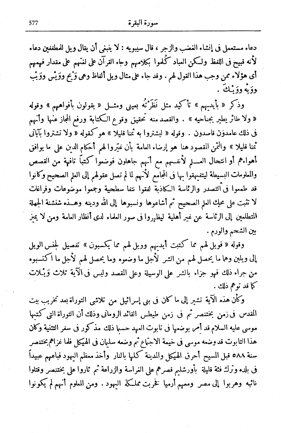 وَقَوْلُهُ: فَوَيْلٌ لَهُمْ مِمَّا كَتَبَتْ أَيْدِيهِمْ وَوَيْلٌ لَهُمْ مِمَّا يَكْسِبُونَ تَفْصِيلٌ لِجِنْسِ الْوَيْلِ إِلَى وَيْلَيْنِ وَهُمَا مَا يَحْصُلُ لَهُمْ مِنَ الشَّرِّ لِأَجْلِ مَا وَضَعُوهُ وَمَا يَحْصُلُ لَهُمْ لِأَجْلِ مَا اكْتَسَبُوهُ مِنْ جَرَّاءَ ذَلِكَ فَهُوَ جَزَاءٌ بِالشَّرِّ عَلَى الْوَسِيلَةِ وَعَلَى الْمَقْصِدِ، وَلَيْسَ فِي الْآيَةِ ثَلَاثُ وَيْلَاتٍ كَمَا قَدْ تَوَهَّمَ ذَلِكَ.