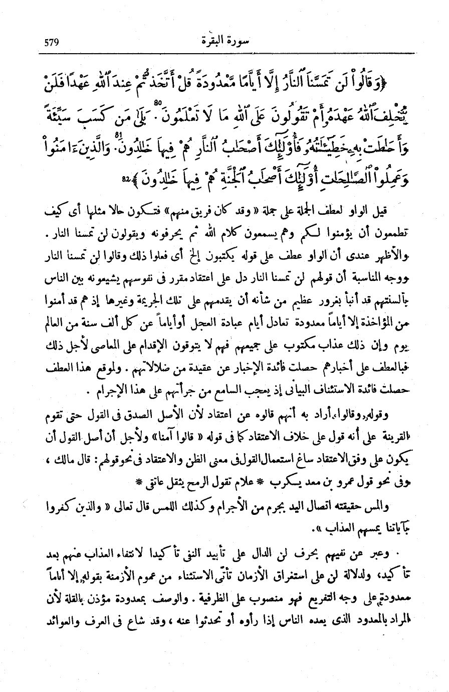 لَنْ تَمَسَّنَا النَّارُ. وَالْأَظْهَرُ عِنْدِي أَنَّ الْوَاوَ عَطْفٌ عَلَى قَوْله يَكْتُبُونَ [الْبَقَرَة: 79] إِلَخْ أَيْ فَعَلُوا ذَلِكَ وَقَالُوا لَنْ تَمَسَّنَا النَّارُ. وَوَجْهُ الْمُنَاسِبَةِ أَنَّ قَوْلَهُمْ لَنْ تَمَسَّنَا النَّارُ دَلَّ عَلَى