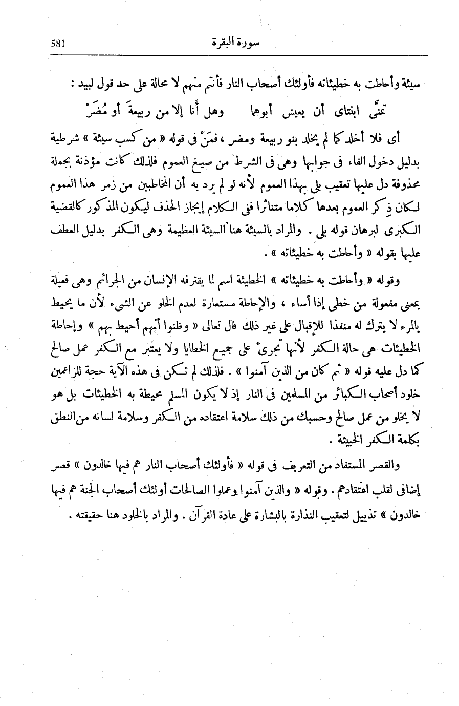 وَمَنْ كَسَبَ سَيِّئَةً وَأَحَاطَتْ بِهِ خَطِيئَاتُهُ فَأُولَئِكَ أَصْحَابُ النَّارِ فَأَنْتُمْ مِنْهُمْ لَا مَحَالَةَ عَلَى حَدِّ قَوْلِ لَبِيدٍ: