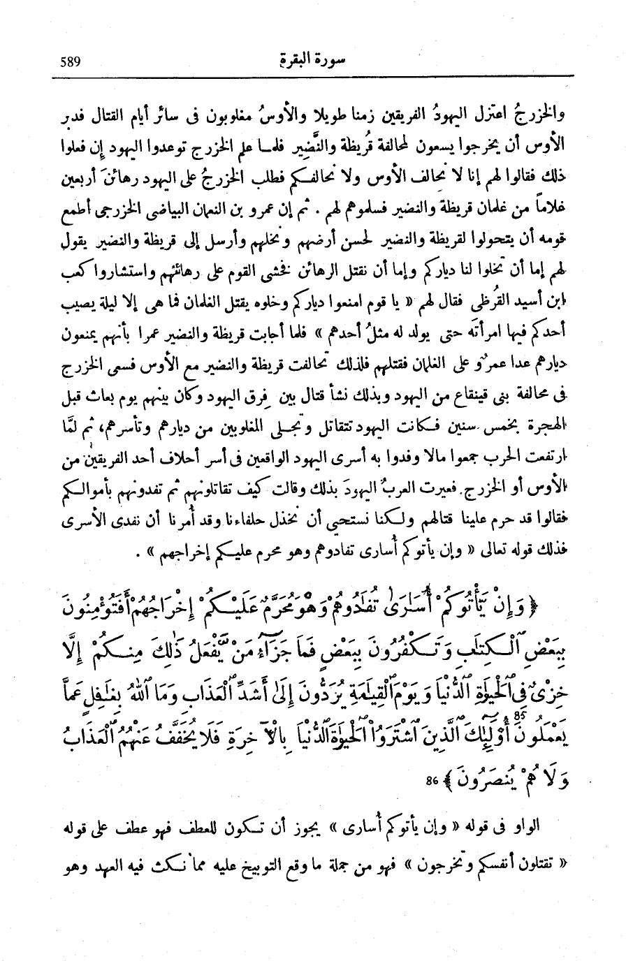 وَإِنْ يَأْتُوكُمْ أُسارى تُفادُوهُمْ وَهُوَ مُحَرَّمٌ عَلَيْكُمْ إِخْراجُهُمْ أَفَتُؤْمِنُونَ بِبَعْضِ الْكِتابِ وَتَكْفُرُونَ بِبَعْضٍ فَما جَزاءُ مَنْ يَفْعَلُ ذلِكَ مِنْكُمْ إِلَّا خِزْيٌ فِي الْحَياةِ الدُّنْيا وَيَوْمَ الْقِيامَةِ يُرَدُّونَ إِلى أَشَدِّ الْعَذابِ وَمَا اللَّهُ بِغافِلٍ عَمَّا تَعْمَلُونَ (85) أُولئِكَ الَّذِينَ اشْتَرَوُا الْحَياةَ الدُّنْيا بِالْآخِرَةِ فَلا يُخَفَّفُ عَنْهُمُ الْعَذابُ وَلا هُمْ يُنْصَرُونَ (86) .