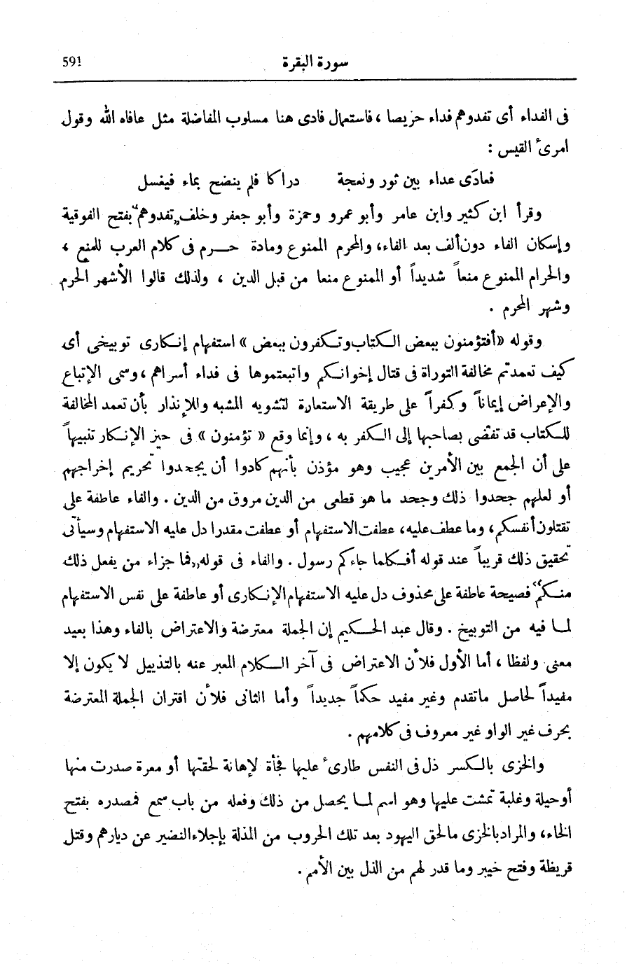 وَقَوْلُهُ: أَفَتُؤْمِنُونَ بِبَعْضِ الْكِتابِ وَتَكْفُرُونَ بِبَعْضٍ اسْتِفْهَامٌ إِنْكَارِيٌّ تَوْبِيخِيٌّ أَيْ كَيْفَ تَعَمَّدْتُمْ مُخَالَفَةَ التَّوْرَاةِ فِي قِتَالِ إِخْوَانِكُمْ وَاتَّبَعْتُمُوهَا فِي فِدَاءِ أَسْرَاهُمْ، وَسُمِّيَ الْإِتْبَاعُ وَالْإِعْرَاضُ إِيمَانًا وَكُفْرًا عَلَى طَرِيقَةِ الِاسْتِعَارَةِ لِتَشْوِيهِ الْمُشَبَّهِ وَلِلْإِنْذَارِ بِأَنَّ تَعَمُّدَ الْمُخَالَفَةِ لِلْكِتَابِ قَدْ تُفْضِي بِصَاحِبِهَا إِلَى الْكُفْرِ بِهِ، وَإِنَّمَا وَقع فَتُؤْمِنُونَ فِي حَيِّزِ الْإِنْكَارِ تَنْبِيهًا عَلَى أَنَّ الْجَمْعَ بَيْنَ الْأَمْرَيْنِ عَجِيبٌ وَهُوَ مُؤْذِنٌ بِأَنَّهُمْ كَادُوا أَنْ يَجْحَدُوا تَحْرِيمَ إِخْرَاجِهِمْ أَوْ لَعَلَّهُمْ جَحَدُوا ذَلِكَ وَجَحْدُ مَا هُوَ قَطْعِيٌّ مِنَ الدِّينِ مُرُوقٌ مِنَ الدِّينِ.