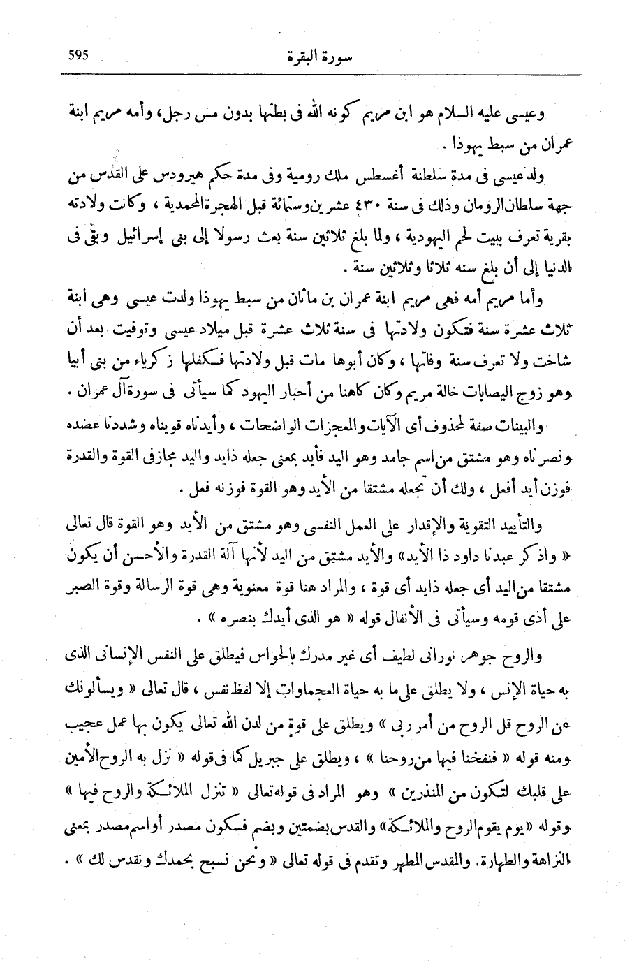 وَالْبَيِّنَاتُ صِفَةٌ لِمَحْذُوفٍ أَيِ الْآيَاتُ وَالْمُعْجِزَاتُ الْوَاضِحَاتُ، وَأَيَّدْناهُ قَوَّيْنَاهُ وَشَدَدْنَا عَضُدَهُ وَنَصَرْنَاهُ وَهُوَ مُشْتَقٌّ مِنَ اسْمٍ جَامِدٍ وَهُوَ الْيَدُ فَأَيَّدَ بِمَعْنَى جَعَلَهُ ذَا يَدٍ وَالْيَدُ مَجَازٌ فِي الْقُوَّةِ وَالْقُدْرَةِ فَوَزْنُ أَيَّدَ أَفْعَلَ، وَلَكَ أَنْ تَجْعَلَهُ مُشْتَقًّا مِنَ الْأَيْدِ وَهُوَ الْقُوَّةُ فَوَزْنُهُ فَعَّلَ.