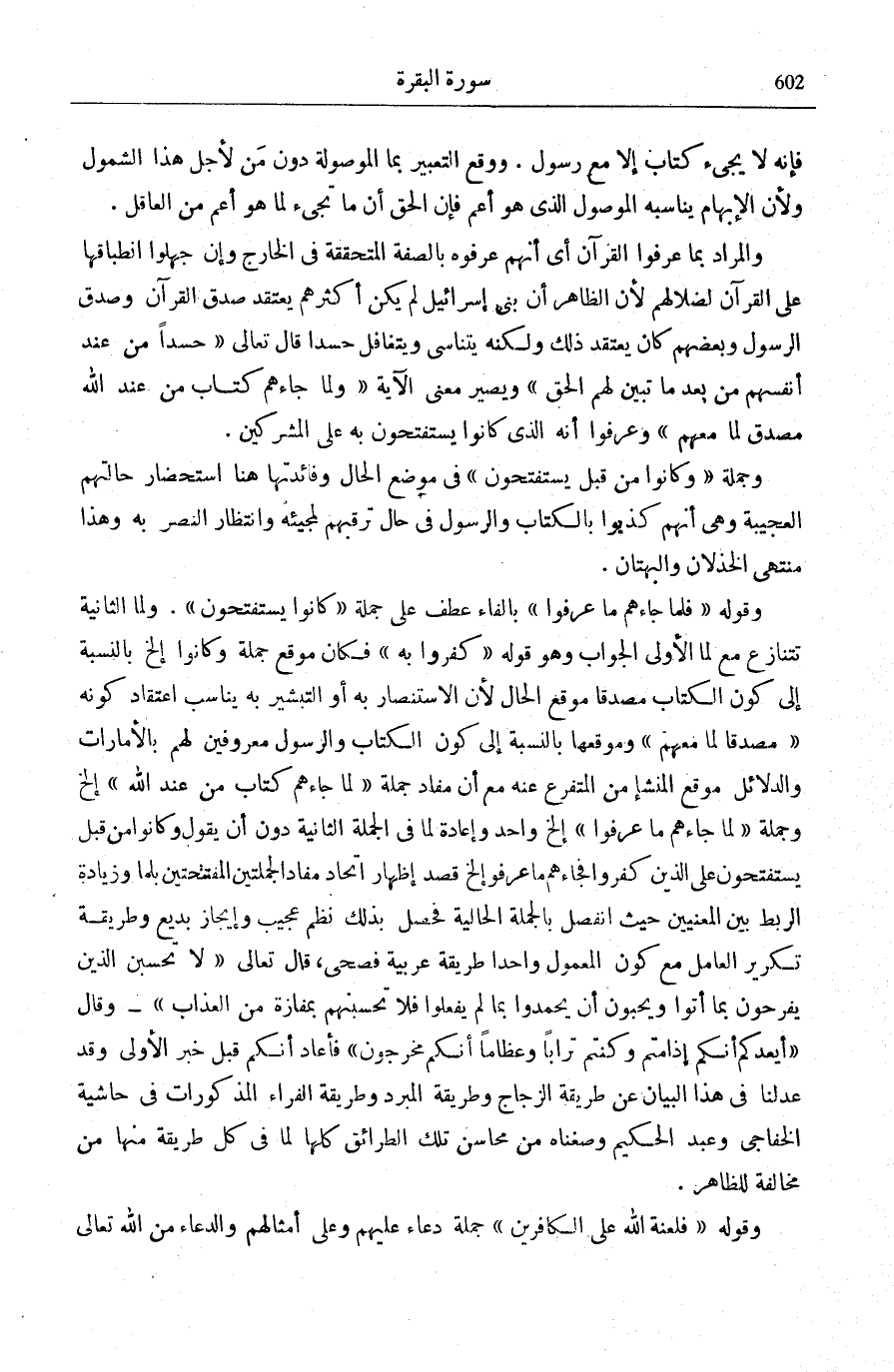 حَسَداً مِنْ عِنْدِ أَنْفُسِهِمْ مِنْ بَعْدِ مَا تَبَيَّنَ لَهُمُ الْحَقُّ [الْبَقَرَة: 109] وَيَصِيرُ معنى الْآيَة: «وَمَا جَاءَهُمْ كِتَابٌ مِنْ عِنْدِ اللَّهِ مُصَدِّقٌ لِمَا مَعَهُمْ» وَعَرَفُوا أَنَّهُ الَّذِي كَانُوا يَسْتَفْتِحُونَ بِهِ عَلَى الْمُشْرِكِينَ.