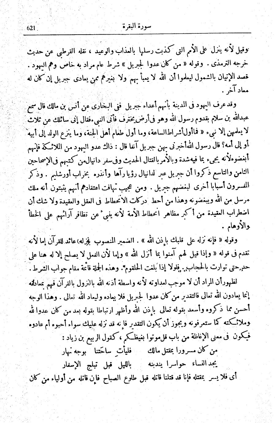 83] . وَهَذِهِ الْجُمْلَةُ قَائِمَةً مَقَامَ جَوَابِ الشَّرْطِ لِظُهُورِ أَنَّ الْمُرَادَ أَنْ لَا مُوجِبَ لِعَدَاوَتِهِ لِأَنَّهُ وَاسِطَةً أَذِنَهُ اللَّهُ بِالنُّزُولِ بِالْقُرْآنِ فَهُمْ بِمُعَادَاتِهِ إِنَّمَا يُعَادُونَ اللَّهَ تَعَالَى فَالتَّقْدِيرُ مَنْ كَانَ عَدُوًّا لِجِبْرِيلَ فَلَا يُعَادِهِ وَلْيُعَادِ اللَّهَ تَعَالَى. وَهَذَا الْوَجْهُ أَحْسَنُ مِمَّا ذَكَرُوهُ وَأَسْعَدُ بِقَوْلِهِ تَعَالَى بِإِذْنِ اللَّهِ وَأَظْهَرُ ارْتِبَاطًا بِقَوْلِهِ بَعْدُ مَنْ كانَ عَدُوًّا لِلَّهِ وَمَلائِكَتِهِ كَمَا سَتَعْرِفُونَهُ وَيَجُوزُ أَنْ يَكُونَ التَّقْدِيرُ فَإِنَّهُ قَدْ نَزَّلَهُ عَلَيْكَ سَوَاءٌ أَحَبُّوهُ أَمْ عَادُوهُ فَيَكُونُ فِي مَعْنَى الْإِغَاظَةِ مِنْ بَابِ قُلْ مُوتُوا بِغَيْظِكُمْ [آل عمرَان: 119] ، كَقَوْلِ الرَّبِيعِ بْنِ زِيَادٍ: