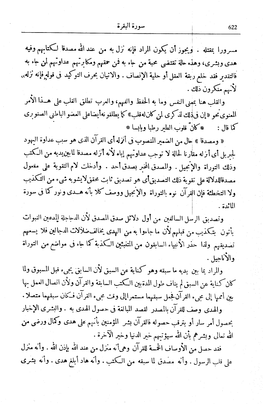 كَأَنَّ قُلُوبَ الطَّيْرِ رَطْبًا وَيَابِسًا ومُصَدِّقاً حَالٌ مِنَ الضَّمِيرِ الْمَنْصُوب فِي نَزَّلَهُ أَيِ الْقُرْآنَ الَّذِي هُوَ سَبَبُ عَدَاوَةِ الْيَهُودِ لِجِبْرِيلَ أَيْ أَنْزَلَهُ مُقَارِنًا لِحَالَةٍ لَا تُوجِبُ عَدَاوَتَهُمْ إِيَّاهُ لِأَنَّهُ أَنْزَلَهُ مُصَدِّقًا لِمَا بَيْنَ يَدَيْهِ مِنَ الْكُتُبِ وَذَلِكَ التَّوْرَاةِ وَالْإِنْجِيلِ. وَالْمُصَدِّقُ الْمُخْبِرُ بِصِدْقِ أَحَدٍ. وَأُدْخِلَتْ لَامُ التَّقْوِيَةِ عَلَى مَفْعُولِ مُصَدِّقاً لِلدَّلَالَةِ عَلَى تَقْوِيَةِ ذَلِكَ التَّصْدِيقِ أَيْ هُوَ تَصْدِيقٌ ثَابِتٌ مُحَقَّقٌ لَا يَشُوبُهُ شَيْءٌ مِنَ التَّكْذِيبِ وَلَا التَّخْطِئَةِ فَإِنَّ الْقُرْآنَ نَوَّهَ بِالتَّوْرَاةِ وَالْإِنْجِيلِ وَوَصَفَ كُلًّا بِأَنَّهُ هُدًى وَنُورٌ كَمَا فِي سُورَةِ الْمَائِدَةِ.