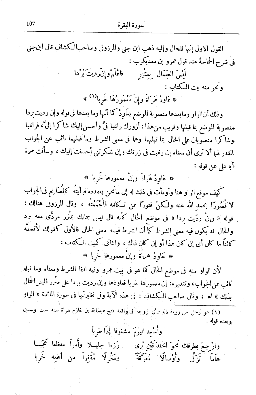لِأَنَّ الْوَاوَ مِنْهُ فِي مَوْضِعِ الْحَالِ كَمَا هُوَ فِي بَيْتِ عَمْرٍو وَفِيهِ لَفْظُ الشَّرْطِ وَمَعْنَاهُ وَمَا قَبْلَهُ نَائِبٌ عَنِ الْجَوَابِ، وَتَقْدِيرُهُ: إِنْ مَعْمُورُهَا خَرِبَا فَعَاوِدْهَا وَإِنْ رُدِّيتَ بُرْدًا عَلَى مِئْزَرٍ فَلَيْسَ الْجَمَالُ بِذَلِكَ» اه.
