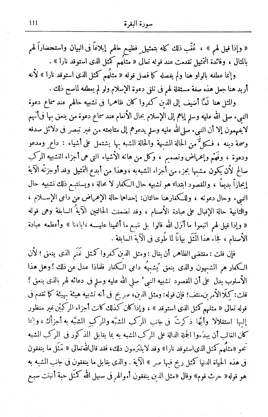 وَالْمَثَلُ هُنَا لَمَّا أُضِيفَ إِلَى الَّذِينَ كَفَرُوا كَانَ ظَاهِرًا فِي تَشْبِيهِ حَالِهِمْ عِنْدَ سَمَاعِ دَعْوَةِ النَّبِيءِ صَلَّى اللهُ عَلَيْهِ وَسَلَّمَ إِيَّاهُمْ إِلَى الْإِسْلَامِ بِحَالِ الْأَنْعَامِ عِنْدَ سَمَاعِ دَعْوَةِ مَنْ يَنْعِقُ بِهَا فِي أَنَّهُمْ لَا يَفْهَمُونَ إِلَّا أَنَّ النَّبِيءَ صَلَّى اللهُ عَلَيْهِ وَسَلَّمَ يَدْعُوهُمْ إِلَى مُتَابَعَتِهِ مِنْ غَيْرِ تَبَصُّرٍ فِي دَلَائِلِ صِدْقِهِ وَصِحَّةِ دِينِهِ، فَكُلٌّ مِنَ الْحَالَةِ الْمُشَبَّهَةِ وَالْحَالَةِ الْمُشَبَّهِ بِهَا يَشْتَمِلُ عَلَى أَشْيَاءَ: دَاعٍ وَمَدْعُوٍّ وَدَعْوَةٍ، وَفَهْمٍ وَإِعْرَاضٍ وَتَصْمِيمٍ، وَكُلٌّ مِنْ هَاتِهِ الْأَشْيَاءِ الَّتِي هِيَ أَجْزَاءُ التَّشْبِيهِ الْمُرَكَّبِ صَالِحٌ لِأَنْ يَكُونَ مُشَبَّهًا بِجُزْءٍ مِنْ أَجْزَاءِ الْمُشَبَّهِ بِهِ، وَهَذَا مِنْ أَبْدَعِ التَّمْثِيلِ وَقَدْ أَوْجَزَتْهُ الْآيَةُ إِيجَازًا بَدِيعًا، وَالْمَقْصُودُ ابْتِدَاءً هُوَ تَشْبِيهُ حَالِ الْكُفَّارِ لَا مَحَالَةَ، وَيَسْتَتْبِعُ ذَلِكَ تَشْبِيهُ حَالِ النَّبِيءِ وَحَالِ دَعْوَتِهِ، وَلِلْكُفَّارِ هُنَا حَالَتَانِ: إِحْدَاهُمَا حَالَةُ الْإِعْرَاضِ عَنْ دَاعِي الْإِسْلَامِ، وَالثَّانِيَةُ حَالَةُ الْإِقْبَالِ عَلَى عِبَادَةِ الْأَصْنَامِ، وَقَدْ تَضَمَّنَتِ الْحَالَتَيْنِ الْآيَةُ السَّابِقَةُ وَهِيَ قَوْلُهُ: وَإِذا قِيلَ لَهُمُ اتَّبِعُوا مَا أَنْزَلَ اللَّهُ قالُوا بَلْ نَتَّبِعُ مَا أَلْفَيْنا عَلَيْهِ آباءَنا [الْبَقَرَة: 170] وَأَعْظَمُهُ عِبَادَةُ الْأَصْنَامِ، فَجَاءَ هَذَا الْمَثَلُ بَيَانًا لِمَا طُوِيَ فِي الْآيَةِ السَّابِقَةِ.