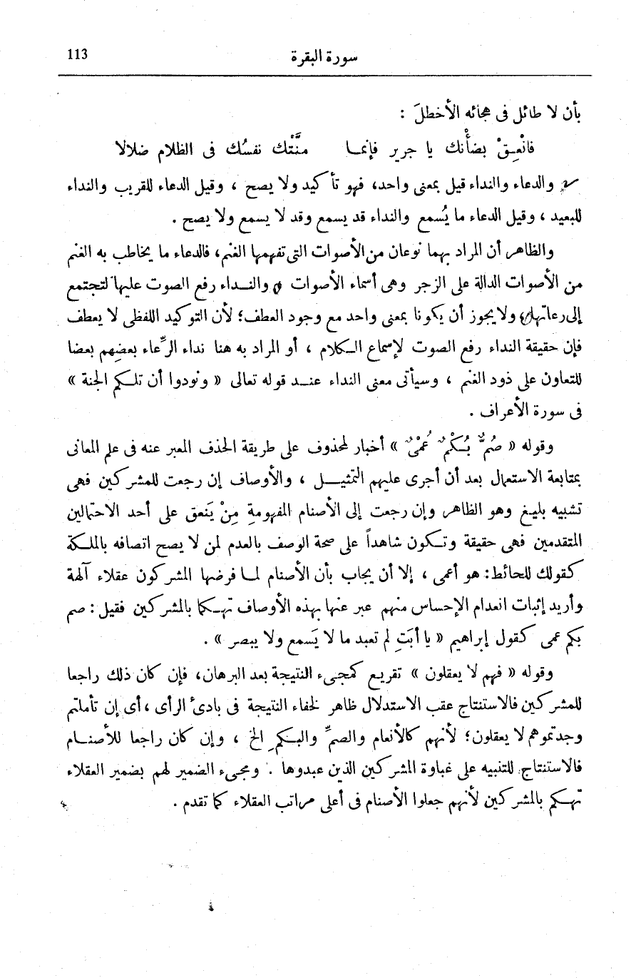 وَقَوْلُهُ: صُمٌّ بُكْمٌ عُمْيٌ أَخْبَارٌ لِمَحْذُوفٍ عَلَى طَرِيقَةِ الْحَذْفِ الْمُعَبَّرِ عَنْهُ فِي عِلْمِ الْمَعَانِي بِمُتَابَعَةِ الِاسْتِعْمَالِ بَعْدَ أَنْ أَجْرَى عَلَيْهِمُ التَّمْثِيلَ، وَالْأَوْصَافُ إِنْ رَجَعَتْ لِلْمُشْرِكِينَ فَهِيَ تَشْبِيهٌ بَلِيغٌ وَهُوَ الظَّاهِرُ وَإِنْ رَجَعَتْ إِلَى الْأَصْنَامِ الْمَفْهُومَةِ مِنْ يَنْعِقُ عَلَى أَحَدِ الِاحْتِمَالَيْنِ الْمُتَقَدِّمَيْنِ فَهِيَ حَقِيقَةٌ وَتَكُونُ شَاهِدًا عَلَى صِحَّةِ الْوَصْفِ بِالْعَدَمِ لِمَنْ لَا يَصِحُّ اتِّصَافُهُ بِالْمَلَكَةِ كَقَوْلِكَ لِلْحَائِطِ: هُوَ أَعْمَى، إِلَّا أَنْ يُجَابَ بِأَنَّ الْأَصْنَامَ لَمَّا فَرَضَهَا الْمُشْرِكُونَ عُقَلَاءَ آلِهَةً وَأُرِيدَ إِثْبَاتُ انْعِدَامِ الْإِحْسَاسِ مِنْهُمْ عُبِّرَ عَنْهَا بِهَذِهِ الْأَوْصَافِ تَهَكُّمًا بِالْمُشْرِكِينَ فَقِيلَ: صُمٌّ بُكْمٌ عُمْيٌ كَقَوْلِ إِبْرَاهِيمَ: يَا أَبَتِ لِمَ تَعْبُدُ مَا لَا يَسْمَعُ وَلا يُبْصِرُ
