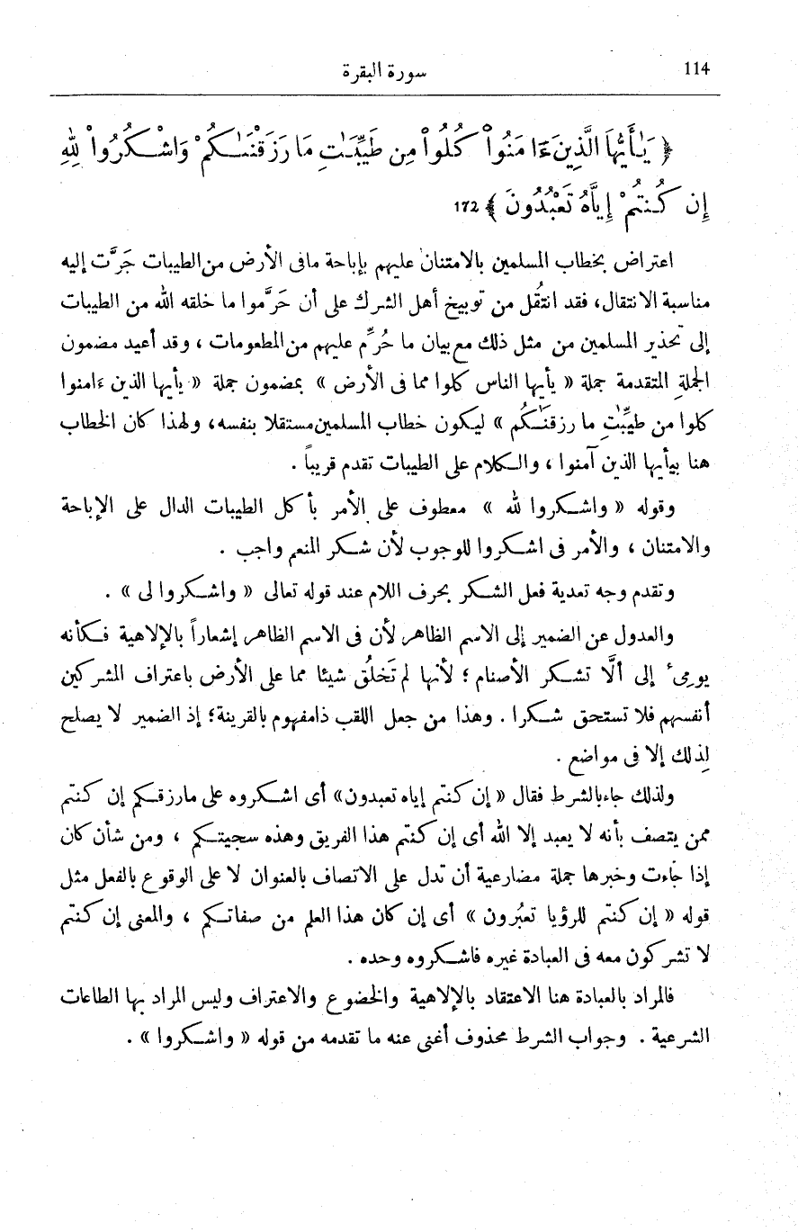 وَالْعُدُولُ عَنِ الضَّمِيرِ إِلَى الِاسْمِ الظَّاهِرِ لِأَنَّ فِي الِاسْمِ الظَّاهِرِ إِشْعَارًا بِالْإِلَهِيَّةِ فَكَأَنَّهُ يُومِئُ إِلَى أَلَّا تُشْكَرَ الْأَصْنَامُ لِأَنَّهَا لَمْ تَخْلُقْ شَيْئًا مِمَّا عَلَى الْأَرْضِ بِاعْتِرَافِ الْمُشْرِكِينَ أَنْفُسِهِمْ فَلَا تَسْتَحِقُّ شُكْرًا. وَهَذَا مِنْ جَعْلِ اللَّقَبِ ذَا مَفْهُومٍ بِالْقَرِينَةِ إِذِ الضَّمِيرُ لَا يَصْلُحُ لِذَلِكَ إِلَّا فِي مَوَاضِعَ. وَلِذَلِكَ جَاءَ بِالشَّرْطِ فَقَالَ: إِنْ كُنْتُمْ إِيَّاهُ تَعْبُدُونَ أَيِ اشْكُرُوهُ عَلَى مَا رَزَقَكُمْ إِنْ كُنْتُمْ مِمَّنْ يَتَّصِفُ بِأَنَّهُ لَا يَعْبُدُ إِلَّا اللَّهَ أَيْ إِنْ كُنْتُمْ هَذَا الْفَرِيقَ وَهَذِهِ سَجِيَّتُكُمْ، وَمِنْ شَأْنِ كَانَ إِذَا جَاءَتْ وَخَبَرُهَا جُمْلَةٌ مُضَارِعِيَّةٌ أَنْ تَدُلَّ عَلَى الِاتِّصَافِ بِالْعُنْوَانِ لَا عَلَى الْوُقُوعِ بِالْفِعْلِ مِثْلَ قَوْلِهِ: إِنْ كُنْتُمْ لِلرُّءْيا تَعْبُرُونَ [يُوسُف: 43] أَيْ إِنْ كَانَ هَذَا الْعِلْمُ مِنْ صِفَاتِكُمْ، وَالْمَعْنَى إِنْ كُنْتُمْ لَا تُشْرِكُونَ مَعَهُ فِي الْعِبَادَةِ غَيْرَهُ فَاشْكُرُوهُ وَحْدَهُ. فَالْمُرَادُ بِالْعِبَادَةِ هُنَا الِاعْتِقَادُ بِالْإِلَهِيَّةِ وَالْخُضُوعُ وَالِاعْتِرَافُ وَلَيْسَ الْمُرَادُ بِهَا الطَّاعَاتِ الشَّرْعِيَّةَ.