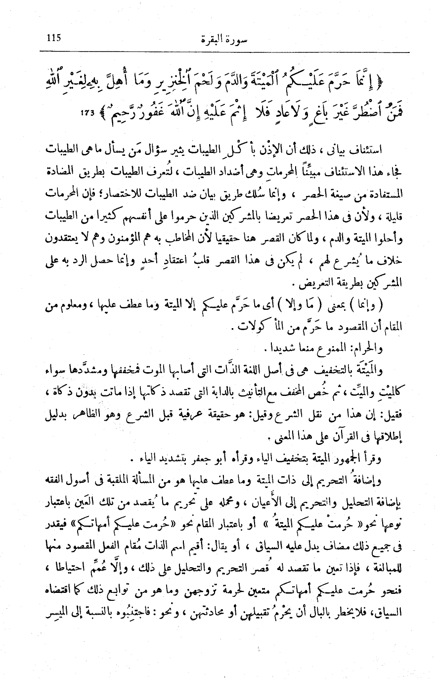 إِنَّما حَرَّمَ عَلَيْكُمُ الْمَيْتَةَ وَالدَّمَ وَلَحْمَ الْخِنْزِيرِ وَما أُهِلَّ بِهِ لِغَيْرِ اللَّهِ فَمَنِ اضْطُرَّ غَيْرَ باغٍ وَلا عادٍ فَلا إِثْمَ عَلَيْهِ إِنَّ اللَّهَ غَفُورٌ رَحِيمٌ (173)