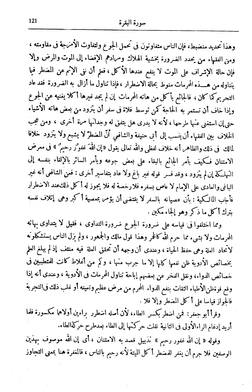 وَمِنْ عَجَبِ الْخِلَافِ بَيْنَ الْفُقَهَاءِ أَنْ يُنْسَبَ إِلَى أَبِي حَنِيفَةَ وَالشَّافِعِيِّ أَنَّ الْمُضْطَرَّ لَا يَشْبَعُ وَلَا يَتَزَوَّدُ خِلَافًا لِمَالِكٍ فِي ذَلِكَ وَالظَّاهِرُ أَنَّهُ خِلَافٌ لَفْظِيٌّ وَاللَّهُ تَعَالَى يَقُولُ: إِنَّ اللَّهَ غَفُورٌ رَحِيمٌ فِي مَعْرِضِ الِامْتِنَانِ فَكَيْفَ يَأْمُرُ الْجَائِعَ بِالْبَقَاءِ عَلَى بَعْضِ جُوعِهِ وَيَأْمُرُ السَّائِرَ بِالْإِلْقَاءِ بِنَفْسِهِ إِلَى التَّهْلُكَةِ إِنْ لَمْ يَتَزَوَّدْ، وَقَدْ فُسِّرَ قَوْلُهُ غَيْرَ باغٍ وَلا عادٍ بِتَفَاسِيرَ أُخْرَى فَعَنِ الشَّافِعِيِّ أَنَّهُ غَيْرُ الْبَاغِي وَالْعَادِي عَلَى الْإِمَامِ لَا عَاصٍ بِسَفَرِهِ فَلَا رُخْصَةَ لَهُ فَلَا يَجُوزُ لَهُ أَكْلُ ذَلِكَ عِنْدَ الِاضْطِرَارِ فَأَجَابَ الْمَالِكِيَّةَ: بِأَنَّ عِصْيَانَهُ بِالسَّفَرِ لَا يَقْتَضِي أَنْ يُؤْمَرَ بِمَعْصِيَةٍ أَكْبَرَ وَهِيَ إِتْلَافُ نَفْسِهِ بِتَرْكِ أَكْلِ مَا ذُكِرَ وَهُوَ إِلْجَاءٌ مَكِينٌ.
