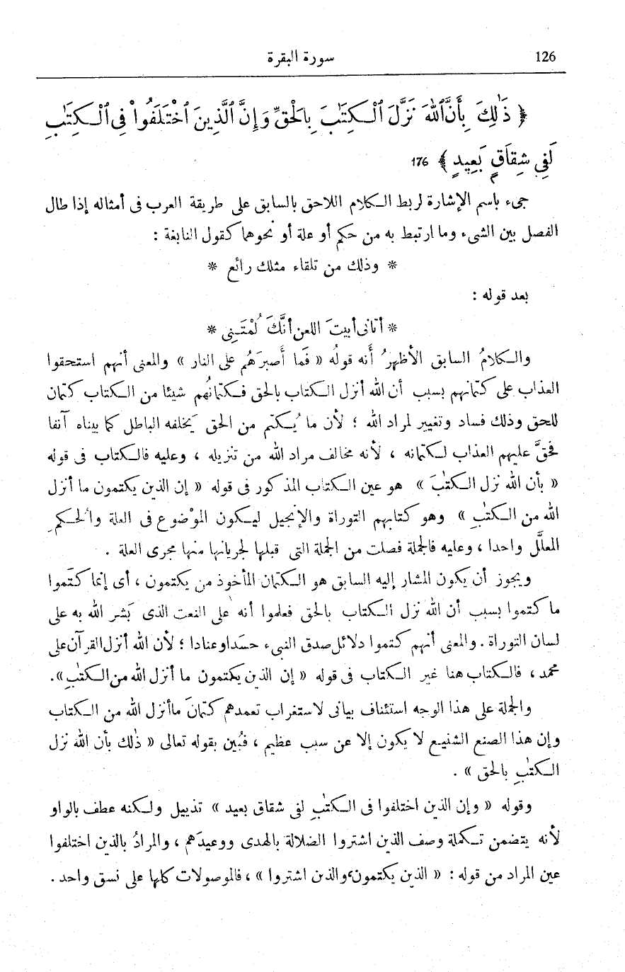 174] ، أَيْ إِنَّمَا كَتَمُوا مَا كَتَمُوا بِسَبَبِ أَنَّ اللَّهَ نَزَّلَ الْكِتَابَ بِالْحَقِّ فَعَلِمُوا أَنَّهُ عَلَى النَّعْتِ الَّذِي بِشَّرَ اللَّهُ بِهِ عَلَى لِسَانِ التَّوْرَاةِ. وَالْمَعْنَى أَنَّهُمْ كَتَمُوا دَلَائِل صدق النَّبِي حَسَدًا وَعِنَادًا لِأَنَّ اللَّهَ أَنْزَلَ الْقُرْآنَ عَلَى مُحَمَّدٍ، فَالْكِتَابُ هُنَا غَيْرُ الْكِتَابِ فِي قَوْلِهِ: إِنَّ الَّذِينَ يَكْتُمُونَ مَا أَنْزَلَ اللَّهُ مِنَ الْكِتابِ [الْبَقَرَة: 174] .