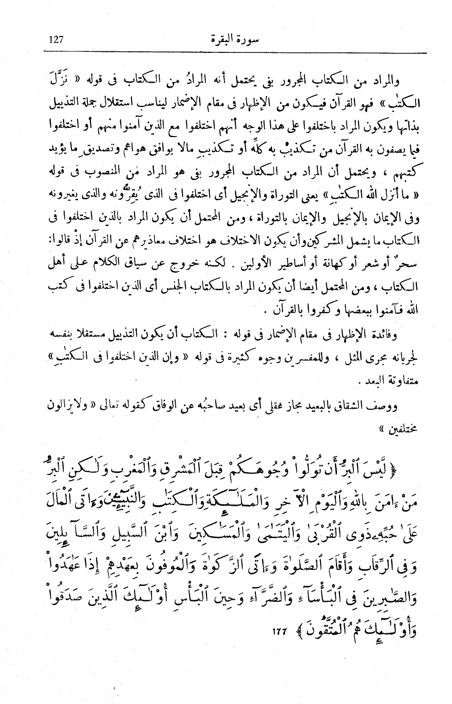 لَيْسَ الْبِرَّ أَنْ تُوَلُّوا وُجُوهَكُمْ قِبَلَ الْمَشْرِقِ وَالْمَغْرِبِ وَلكِنَّ الْبِرَّ مَنْ آمَنَ بِاللَّهِ وَالْيَوْمِ الْآخِرِ وَالْمَلائِكَةِ وَالْكِتابِ وَالنَّبِيِّينَ وَآتَى الْمالَ عَلى حُبِّهِ ذَوِي الْقُرْبى وَالْيَتامى وَالْمَساكِينَ وَابْنَ السَّبِيلِ وَالسَّائِلِينَ وَفِي الرِّقابِ وَأَقامَ الصَّلاةَ وَآتَى الزَّكاةَ وَالْمُوفُونَ بِعَهْدِهِمْ إِذا عاهَدُوا وَالصَّابِرِينَ فِي الْبَأْساءِ وَالضَّرَّاءِ وَحِينَ الْبَأْسِ أُولئِكَ الَّذِينَ صَدَقُوا وَأُولئِكَ هُمُ الْمُتَّقُونَ