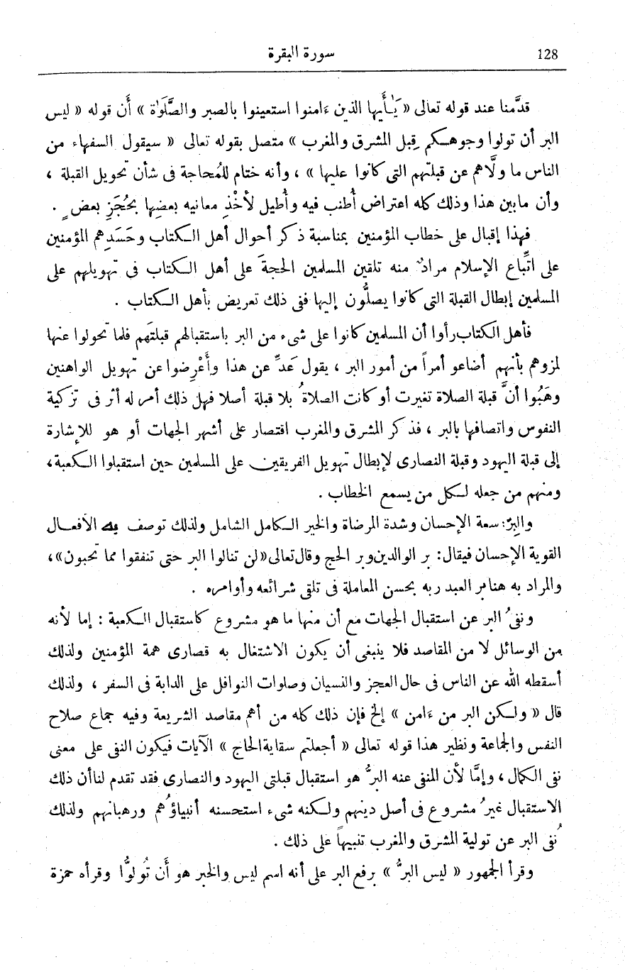 وَنَفْيُ الْبِرِّ عَنِ اسْتِقْبَالِ الْجِهَاتِ مَعَ أَنَّ مِنْهَا مَا هُوَ مَشْرُوعٌ كَاسْتِقْبَالِ الْكَعْبَةِ: إِمَّا لِأَنَّهُ مِنَ الْوَسَائِلِ لَا مِنَ الْمَقَاصِدِ فَلَا يَنْبَغِي أَنْ يَكُونَ الِاشْتِغَالُ بِهِ قُصَارَى هِمَّةِ الْمُؤْمِنِينَ وَلِذَلِكَ أَسْقَطَهُ اللَّهُ عَنِ النَّاسِ فِي حَالِ الْعَجْزِ وَالنِّسْيَانِ وَصَلَوَاتِ النَّوَافِلِ عَلَى الدَّابَّةِ فِي السَّفَرِ، وَلِذَلِكَ قَالَ: وَلكِنَّ الْبِرَّ مَنْ آمَنَ إِلَخْ فَإِنَّ ذَلِكَ كُلَّهُ مِنْ أَهَمِّ مَقَاصِدِ الشَّرِيعَةِ وَفِيهِ جِمَاعُ صَلَاحِ النَّفْسِ وَالْجَمَاعَةِ، وَنَظِيرُ هَذَا قَوْلُهُ تَعَالَى: أَجَعَلْتُمْ سِقايَةَ الْحاجِّ [التَّوْبَة: 19] الْآيَاتِ فَيَكُونُ النَّفْيُ عَلَى مَعْنَى نَفْيِ الْكَمَالِ، وَإِمَّا لِأَنَّ الْمَنْفِيَّ عَنْهُ الْبِرَّ هُوَ اسْتِقْبَالُ قِبْلَتَيِ الْيَهُودِ وَالنَّصَارَى فَقَدْ تَقَدَّمَ لَنَا أَنَّ ذَلِكَ الِاسْتِقْبَالَ غَيْرُ مَشْرُوعٍ فِي أَصْلِ دِينِهِمْ وَلَكِنَّهُ شَيْءٌ اسْتَحْسَنَهُ أَنْبِيَاؤُهُمْ وَرُهْبَانُهُمْ وَلِذَلِكَ نُفِيَ الْبَرُّ عَنْ تَوْلِيَةِ الْمَشْرِقِ وَالْمَغْرِبِ تَنْبِيهًا عَلَى ذَلِكَ.