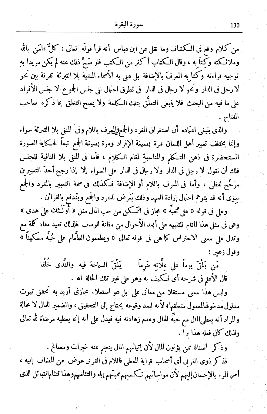 مِنْ كَلَامٍ وَقَعَ فِي «الْكَشَّافِ» وَمَا نُقِلَ عَنِ ابْنِ عَبَّاسٍ أَنَّهُ قَرَأَ قَوْلَهُ تَعَالَى: كُلٌّ آمَنَ بِاللَّهِ وَمَلائِكَتِهِ وَكُتُبِهِ [الْبَقَرَة: 285] ، وَقَالَ الْكِتَابُ أَكْثَرُ مِنَ الْكُتُبِ فَلَوْ صَحَّ عَنْهُ لَمْ يَكُنْ مُرِيدًا بِهِ تَوْجِيهَ قِرَاءَتِهِ (وَكِتَابِهِ) الْمُعَرَّفِ بِالْإِضَافَةِ بَلْ عَنَى بِهِ الْأَسْمَاء المنفية بِلَا التَّبْرِئَةِ تَفْرِقَةً بَيْنَ