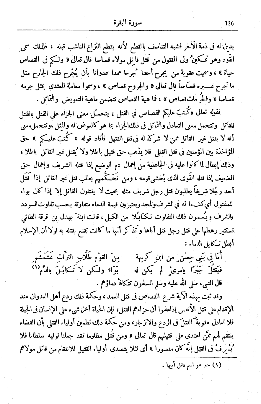 فَقَوْلُهُ تَعَالَى: كُتِبَ عَلَيْكُمُ الْقِصاصُ فِي الْقَتْلى يَتَحَمَّلُ مَعْنَى الْجَزَاءِ عَلَى الْقَتْلِ بِالْقَتْلِ لِلْقَاتِلِ وَتَتَحَمَّلُ مَعْنَى التَّعَادُلِ وَالتَّمَاثُلِ فِي ذَلِكَ الْجَزَاءِ بِمَا هُوَ كَالْعِوَضِ لَهُ وَالْمِثْلِ، وَتَتَحَمَّلُ مَعْنَى أَنَّهُ لَا يُقْتَلُ غَيْرُ الْقَاتِلِ مِمَّنْ لَا شَرِكَةَ لَهُ فِي قَتْلِ الْقَتِيلِ فَأَفَادَ قَوْلُهُ: كُتِبَ عَلَيْكُمُ حَقَّ الْمُؤَاخَذَةِ بَيْنَ الْمُؤْمِنِينَ فِي قَتْلِ الْقَتْلَى فَلَا يَذْهَبُ حَقُّ قَتِيلٍ بَاطِلًا وَلَا يُقْتَلُ غَيْرُ الْقَاتِلِ بَاطِلًا، وَذَلِكَ إِبْطَالٌ لِمَا كَانُوا عَلَيْهِ فِي الْجَاهِلِيَّةِ مِنْ إِهْمَالِ دَمِ الْوَضِيعِ إِذَا قَتَلَهُ الشَّرِيفُ وَإِهْمَالِ حَقِّ الضَّعِيفِ إِذَا قَتَلَهُ الْقَوِيُّ الَّذِي يُخْشَى قَوْمُهُ، وَمِنْ تَحَكُّمِهِمْ بِطَلَبِ قَتْلِ غَيْرِ الْقَاتِلِ إِذَا قَتَلَ أَحَدٌ رَجُلًا شَرِيفًا يَطْلُبُونَ قَتْلَ رَجُلٍ شَرِيفٍ مِثْلِهِ بِحَيْثُ لَا يَقْتُلُونَ الْقَاتِلَ إِلَّا إِذَا كَانَ بَوَاءً للمقتول أَي كف ءا لَهُ فِي الشَّرَفِ وَالْمَجْدِ وَيَعْتَبِرُونَ قِيمَةَ الدِّمَاءِ مُتَفَاوِتَةً بِحَسب تفَاوت السودد وَالشَّرَفِ وَيُسَمُّونَ ذَلِكَ التَّفَاوُتَ تَكَايُلًا مِنَ الْكَيْلِ، قَالَتِ ابْنَةُ بَهْدَلِ بْنِ قَرَقَةَ الطَّائِيِّ تَسْتَثِيرُ رَهْطَهَا عَلَى قَتْلِ رَجُلٍ قَتَلَ أَبَاهَا وَتَذْكُرُ أَنَّهَا مَا كَانَتْ تَقْنَعُ بِقَتْلِهِ بِهِ لَوْلَا أَنَّ الْإِسْلَامَ أَبْطَلَ تَكَايُلَ الدِّمَاءِ: