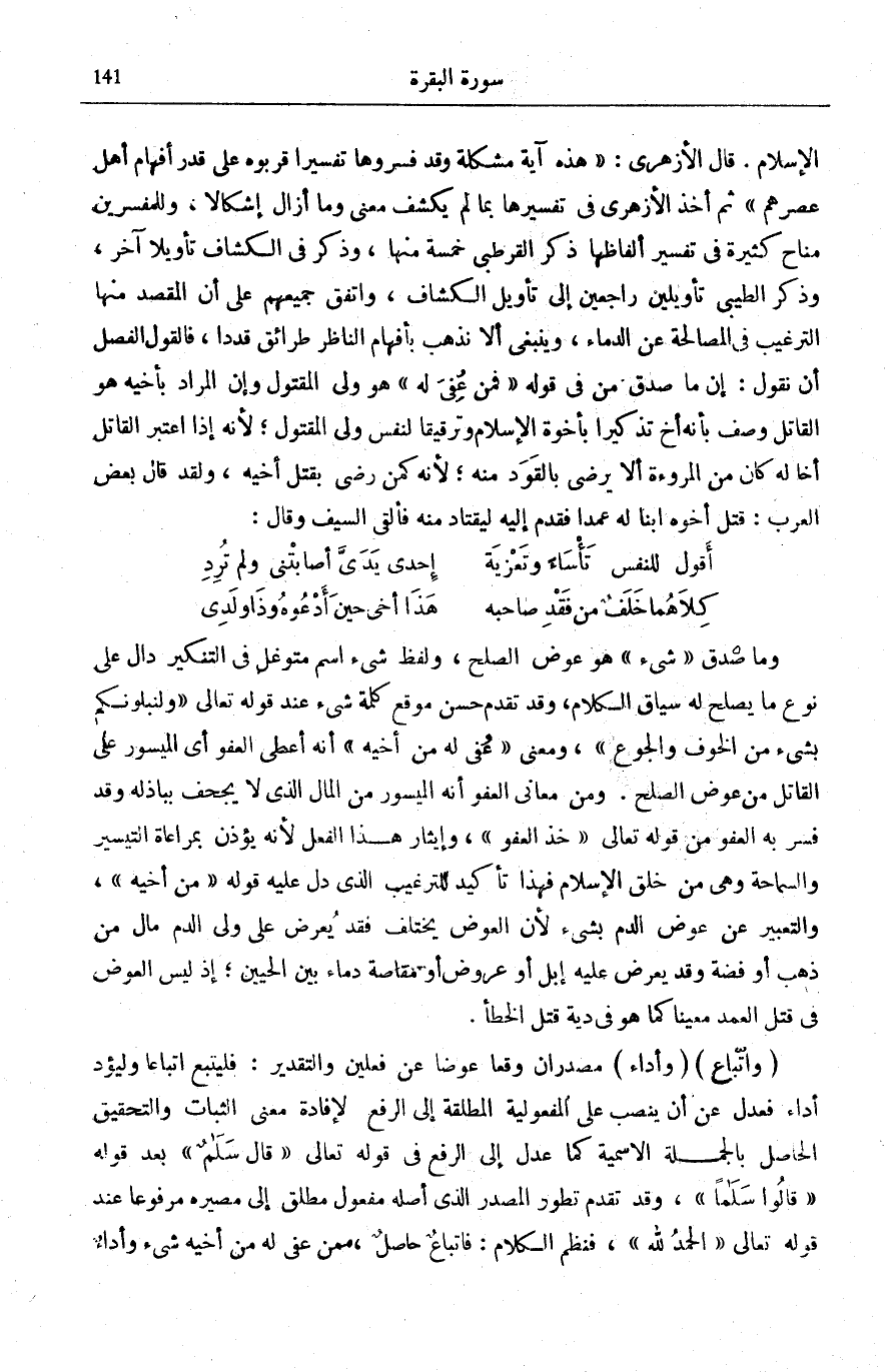 التَّرْغِيبُ فِي الْمُصَالَحَةِ عَنِ الدِّمَاءِ، وَيَنْبَغِي أَلَّا نَذْهَبَ بِأَفْهَامِ النَّاظِرِ طَرَائِقَ قِدَدًا، فَالْقَوْلُ الْفَصْلُ أَنْ نقُول: إِن مَا صدق مَنْ فِي قَوْلِهِ: فَمَنْ عُفِيَ لَهُ هُوَ وَلِيُّ الْمَقْتُولِ وَإِنَّ الْمُرَادَ بِأَخِيهِ هُوَ الْقَاتِل وَصفا بِأَنَّهُ أَخٌ تَذْكِيرًا بِأُخُوَّةِ الْإِسْلَامِ وَتَرْقِيقًا لِنَفْسِ وَلِيِّ الْمَقْتُولِ لِأَنَّهُ إِذَا اعْتَبَرَ الْقَاتِلَ أَخًا لَهُ كَانَ مِنَ الْمُرُوءَةِ أَلَّا يَرْضَى بِالْقَوْدِ مِنْهُ لِأَنَّهُ كَمَنْ رَضِيَ بِقَتْلِ أَخِيهِ، وَلَقَدْ قَالَ بَعْضُ الْعَرَبِ: قَتَلَ أَخُوهُ ابْنًا لَهُ عَمْدًا فَقُدِّمَ إِلَيْهِ لِيَقْتَادَ مِنْهُ فَأَلْقَى السَّيْفَ وَقَالَ: