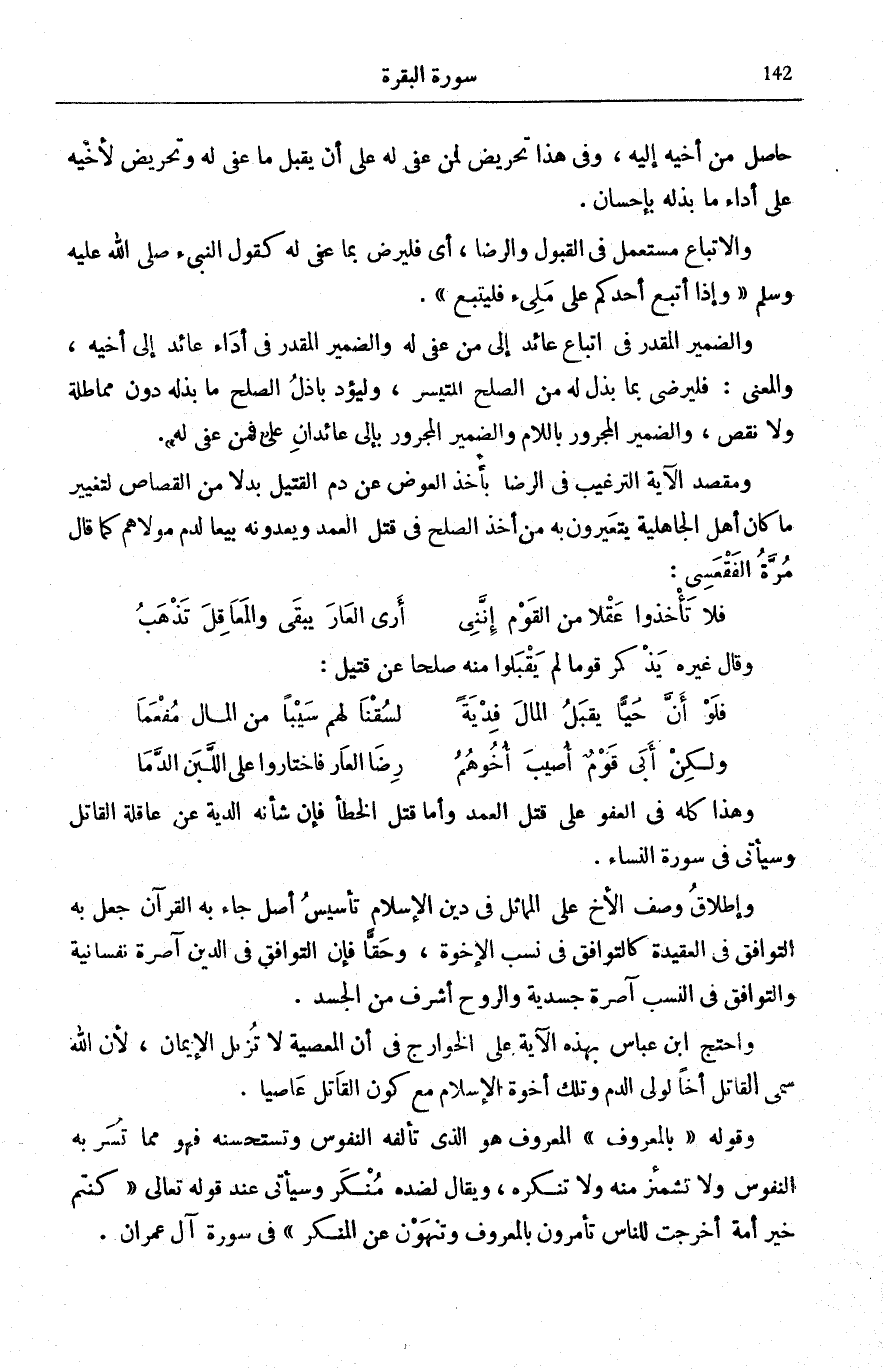 وَمَقْصِدُ الْآيَةِ التَّرْغِيبُ فِي الرِّضَا بِأَخْذِ الْعِوَضِ عَنْ دَمِ الْقَتِيلِ بَدَلًا مِنَ الْقِصَاصِ لِتَغْيِيرِ مَا كَانَ أَهْلُ الْجَاهِلِيَّةِ يَتَعَيَّرُونَ بِهِ مِنْ أَخْذِ الصُّلْحِ فِي قَتْلِ الْعَمْدِ وَيُعِدُّونَهُ بَيْعًا لِدَمِ مَوْلَاهُمْ كَمَا قَالَ مُرَّةُ الْفَقْعَسِيُّ: