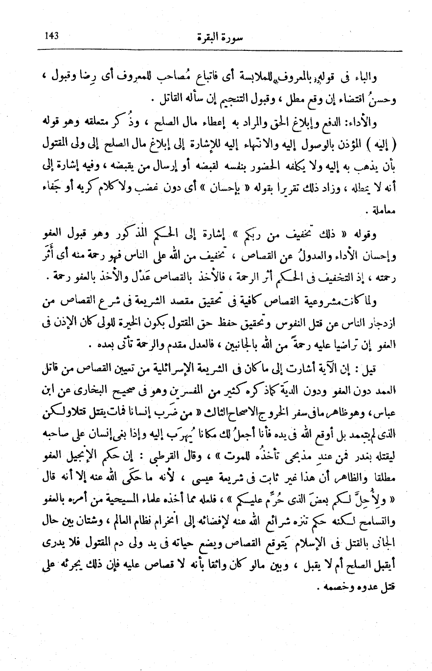 قِيلَ: إِنَّ الْآيَةَ أَشَارَتْ إِلَى مَا كَانَ فِي الشَّرِيعَةِ الْإِسْرَائِيلِيَّةِ مِنْ تَعْيِينِ الْقِصَاصِ مِنْ قَاتِلِ الْعَمْدِ دُونَ الْعَفْوِ وَدُونَ الدِّيَةِ كَمَا ذَكَرَهُ كَثِيرٌ مِنَ الْمُفَسِّرِينَ وَهُوَ فِي «صَحِيحِ الْبُخَارِيِّ» عَنِ ابْنِ عَبَّاسٍ، وَهُوَ ظَاهِرُ مَا فِي سِفْرِ الْخُرُوجِ الْإِصْحَاحِ الثَّالِثِ: «مَنْ ضَرَبَ إِنْسَانًا فَمَاتَ يُقْتَلُ قَتْلًا وَلَكِنَّ الَّذِي لَمْ يَتَعَمَّدْ بَلْ أَوْقَعَ اللَّهُ فِي يَدِهِ فَأَنَا أَجْعَلُ لَكَ مَكَانًا يُهْرَبُ إِلَيْهِ وَإِذَا بَغَى إِنْسَانٌ عَلَى صَاحِبِهِ لِيَقْتُلَهُ بِغَدْرٍ فَمِنْ عِنْدِ مَذْبَحِي تَأْخُذُهُ لِلْمَوْتِ» ، وَقَالَ الْقُرْطُبِيُّ: إِنَّ حُكْمَ الْإِنْجِيلِ الْعَفْوُ مُطْلَقًا وَالظَّاهِرُ أَنَّ هَذَا غَيْرُ ثَابِتٍ فِي شَرِيعَةِ عِيسَى، لِأَنَّهُ مَا حَكَى اللَّهُ عَنْهُ إِلَّا أَنَّهُ قَالَ: وَلِأُحِلَّ لَكُمْ بَعْضَ الَّذِي حُرِّمَ عَلَيْكُمْ [آل عمرَان: 50] ، فَلَعَلَّهُ مِمَّا أَخَذَهُ عُلَمَاءُ الْمَسِيحِيَّةِ مِنْ أَمْرِهِ بِالْعَفْوِ وَالتَّسَامُحِ لَكِنَّهُ حُكْمٌ تُنَزَّهُ شَرَائِعُ اللَّهِ عَنْهُ لِإِفْضَائِهِ إِلَى انْخِرَامِ نِظَامِ الْعَالَمِ، وَشَتَّانَ بَيْنَ حَالِ الْجَانِي بِالْقَتْلِ فِي الْإِسْلَامِ يَتَوَقَّعُ الْقِصَاصَ وَيَضَعُ حَيَاتَهُ فِي يَدِ وَلِيِّ دَمِ الْمَقْتُولِ فَلَا يَدْرِي أَيَقْبَلُ الصُّلْحَ أَمْ لَا يَقْبَلُ، وَبَيْنَ مَا لَوْ كَانَ وَاثِقًا بِأَنَّهُ لَا قِصَاصَ عَلَيْهِ فَإِنَّ ذَلِكَ يُجَرِّئُهُ عَلَى قَتْلِ عَدُوِّهِ وَخَصْمِهِ.