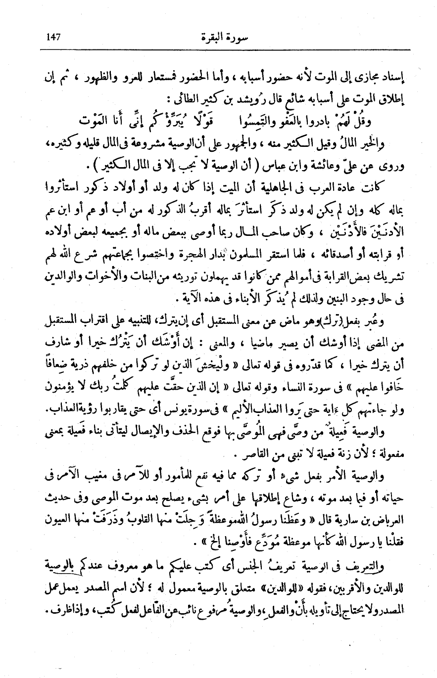 وَالتَّعْرِيفُ فِي الْوَصِيَّةِ تَعْرِيفُ الْجِنْسِ أَيْ كُتِبَ عَلَيْكُمْ مَا هُوَ مَعْرُوفٌ عِنْدَكُمْ بِالْوَصِيَّةِ لِلْوَالِدَيْنِ وَالْأَقْرَبِينَ، فَقَوْلُهُ: لِلْوالِدَيْنِ مُتَعَلِّقٌ بِالْوَصِيَّةِ مَعْمُولٌ لَهُ لِأَنَّ اسْمَ الْمَصْدَرِ يَعْمَلُ عَمَلَ الْمَصْدَرِ وَلَا يَحْتَاجُ إِلَى تَأْوِيله بِأَن وَالْفِعْلِ، وَالْوَصِيَّة مَرْفُوعٌ نَائِبٌ عَنِ الْفَاعِلِ لِفِعْلِ كُتِبَ، وإِذا ظَرْفٌ.