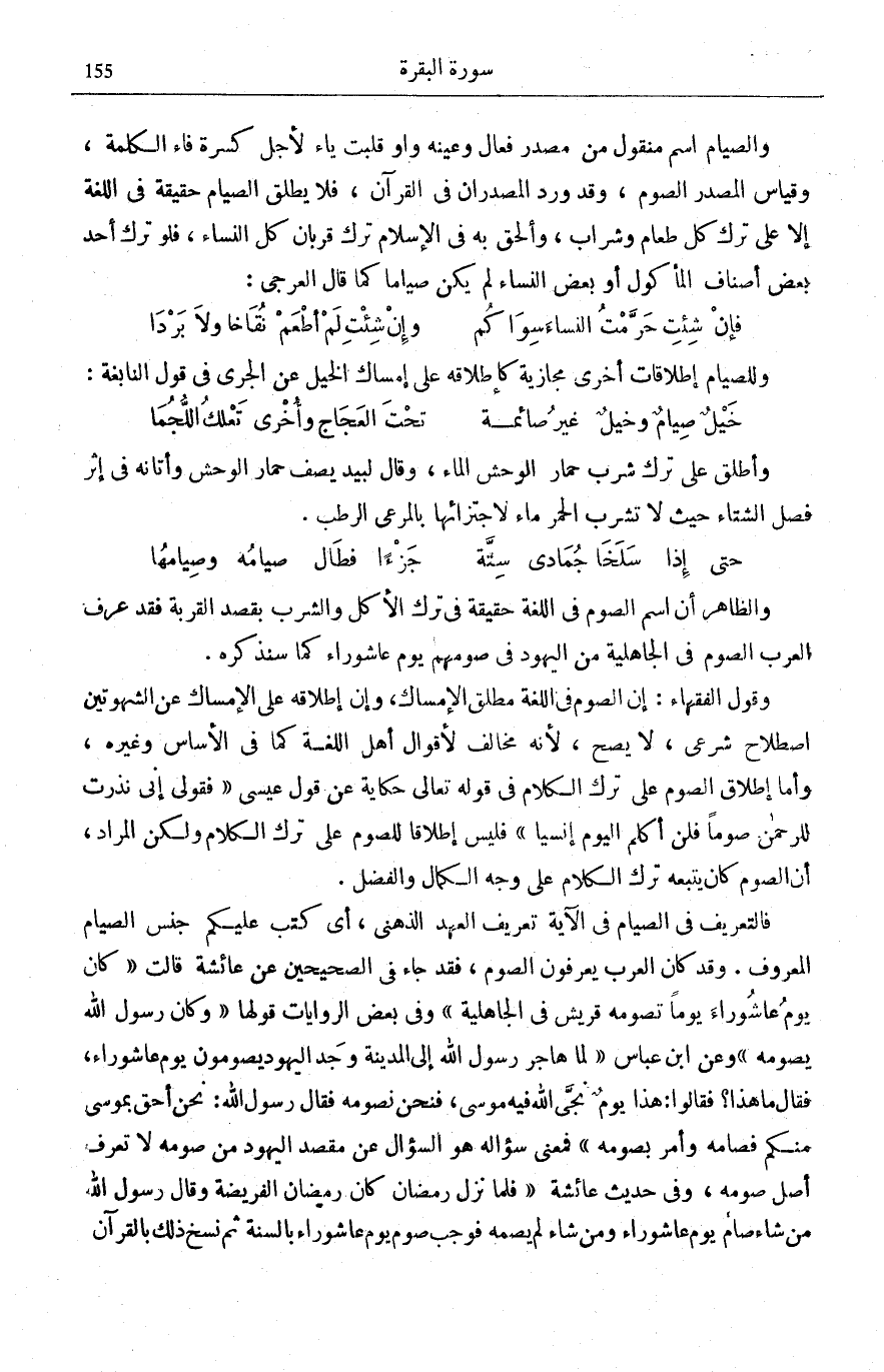عَرَفَ الْعَرَبُ الصَّوْمَ فِي الْجَاهِلِيَّةِ مِنَ الْيَهُودِ فِي صَوْمِهِمْ يَوْمَ عَاشُورَاءَ كَمَا سَنَذْكُرُهُ. وَقَوْلُ الْفُقَهَاءِ: إِنَّ الصَّوْمَ فِي اللُّغَةِ مُطْلَقُ الْإِمْسَاكِ، وَإِنَّ إِطْلَاقَهُ عَلَى الْإِمْسَاكِ عَنِ الشَّهْوَتَيْنِ اصْطِلَاحٌ شَرْعِيٌّ، لَا يَصِحُّ، لِأَنَّهُ مُخَالِفٌ لِأَقْوَالِ أَهْلِ اللُّغَةِ كَمَا فِي «الْأَسَاسِ» وَغَيْرِهِ، وَأَمَّا إِطْلَاقُ الصَّوْمِ عَلَى تَرْكِ الْكَلَامِ فِي قَوْلِهِ تَعَالَى حِكَايَةً عَنْ قَوْلِ عِيسَى: فَقُولِي إِنِّي نَذَرْتُ لِلرَّحْمنِ صَوْماً فَلَنْ أُكَلِّمَ الْيَوْمَ إِنْسِيًّا [مَرْيَم: 26] فَلَيْسَ إِطْلَاقًا لِلصَّوْمِ عَلَى تَرْكِ الْكَلَامِ وَلَكِنَّ الْمُرَادَ أَنَّ الصَّوْمَ كَانَ يَتْبَعُهُ تَرْكُ الْكَلَامِ عَلَى وَجْهِ الْكَمَالِ وَالْفَضْلِ.