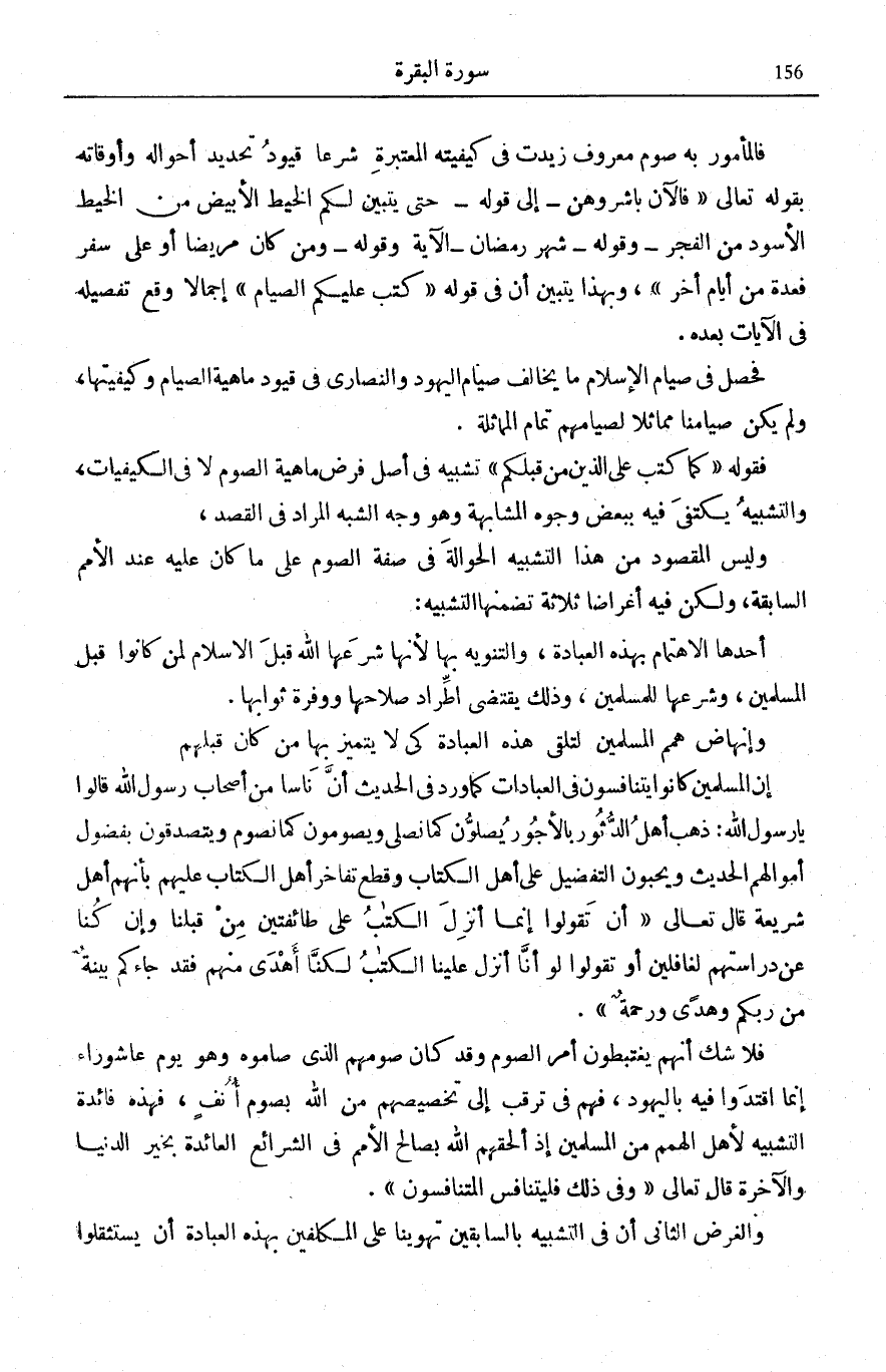 فَحَصَلَ فِي صِيَامِ الْإِسْلَامِ مَا يُخَالِفُ صِيَامَ الْيَهُودِ وَالنَّصَارَى فِي قُيُودِ مَاهِيَّةِ الصِّيَامِ وَكَيْفِيَّتِهَا، وَلَمْ يَكُنْ صِيَامُنَا مُمَاثِلًا لِصِيَامِهِمْ تَمَامَ الْمُمَاثَلَةِ. فَقَوْلُهُ: كَما كُتِبَ عَلَى الَّذِينَ مِنْ قَبْلِكُمْ تَشْبِيهٌ فِي أَصْلِ فَرْضِ مَاهِيَّة الصَّوْم لَا فِي الْكَيْفِيَّاتِ، وَالتَّشْبِيهُ يُكْتَفَى فِيهِ بِبَعْضِ وُجُوهِ الْمُشَابَهَةِ وَهُوَ وَجْهُ الشَّبَهِ الْمُرَادُ فِي الْقَصْدِ، وَلَيْسَ الْمَقْصُودُ مِنْ هَذَا التَّشْبِيهِ الْحَوَالَةَ فِي صِفَةِ الصَّوْمِ عَلَى مَا كَانَ عَلَيْهِ عِنْدَ الْأُمَمِ السَّابِقَة، وَلَكِن فيهم أَغْرَاضًا ثَلَاثَةً تَضَمَّنَهَا التَّشْبِيهُ: