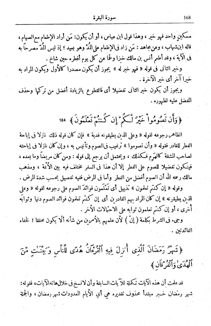 شَهْرُ رَمَضانَ الَّذِي أُنْزِلَ فِيهِ الْقُرْآنُ هُدىً لِلنَّاسِ وَبَيِّناتٍ مِنَ الْهُدى وَالْفُرْقانِ فَمَنْ شَهِدَ مِنْكُمُ الشَّهْرَ فَلْيَصُمْهُ وَمَنْ كانَ مَرِيضاً أَوْ عَلى سَفَرٍ فَعِدَّةٌ مِنْ أَيَّامٍ أُخَرَ يُرِيدُ اللَّهُ بِكُمُ الْيُسْرَ وَلا يُرِيدُ بِكُمُ الْعُسْرَ وَلِتُكْمِلُوا الْعِدَّةَ وَلِتُكَبِّرُوا اللَّهَ عَلى مَا هَداكُمْ وَلَعَلَّكُمْ تَشْكُرُونَ (185)
