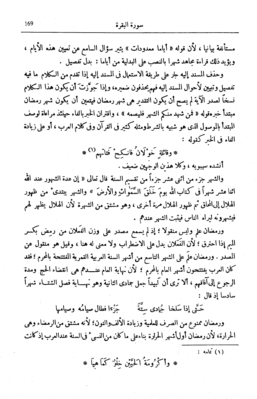 وَحَذْفُ الْمُسْنَدِ إِلَيْهِ جَارٍ عَلَى طَرِيقَةِ الِاسْتِعْمَالِ فِي الْمُسْنَدِ إِلَيْهِ إِذَا تَقَدَّمَ مِنَ الْكَلَامِ مَا فِيهِ تَفْصِيلٌ وَتَبْيِينٌ لِأَحْوَالِ الْمُسْنَدِ إِلَيْهِ فَهُمْ يَحْذِفُونَ ضَمِيرَهُ، وَإِذَا جَوَّزْتَ أَنْ يَكُونَ هَذَا الْكَلَامُ نَسْخًا لِصَدْرِ الْآيَةِ لَمْ يَصِحَّ أَنْ يَكُونَ التَّقْدِيرُ هِيَ شَهْرُ رَمَضَانَ فَيَتَعَيَّنُ أَنْ يَكُونَ شَهْرُ رَمَضَان مُبْتَدأ خبرهم قَوْلُهُ: فَمَنْ شَهِدَ مِنْكُمُ الشَّهْرَ فَلْيَصُمْهُ، وَاقْتِرَانُ الْخَبَرِ بِالْفَاءِ حِينَئِذٍ مُرَاعَاةٌ لِوَصْفِ الْمُبْتَدَأِ بِالْمَوْصُولِ الَّذِي هُوَ شَبِيهٌ بِالشَّرْطِ وَمِثْلُهُ كَثِيرٌ فِي الْقُرْآنِ وَفِي كَلَامِ الْعَرَبِ، أَوْ عَلَى زِيَادَةِ الْفَاءِ فِي الْخَبَرِ كَقَوْلِهِ: