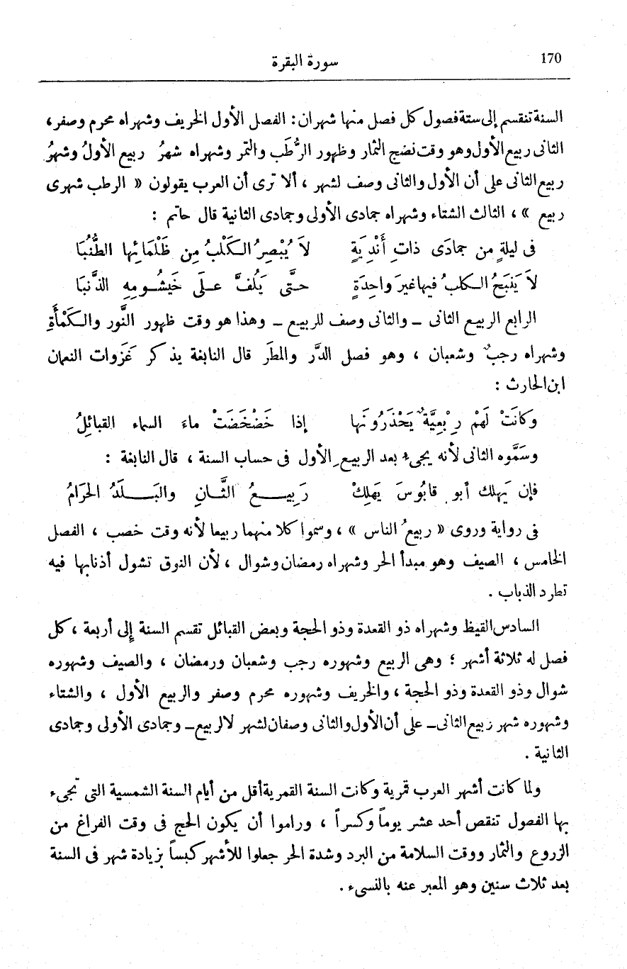 وَلَمَّا كَانَتْ أَشْهُرُ الْعَرَبِ قَمَرِيَّةً وَكَانَتِ السَّنَةُ الْقَمَرِيَّةُ أَقَلَّ مِنْ أَيَّامِ السَّنَةِ الشَّمْسِيَّةِ الَّتِي