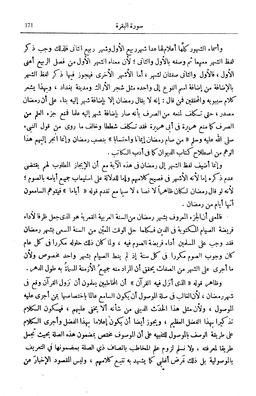 وَإِنَّمَا أضيف لفظ الشَّهْرُ إِلَى رَمَضَانَ فِي هَذِهِ الْآيَةِ مَعَ أَنَّ الْإِيجَازَ الْمَطْلُوب لَهُم يتقضي عَدَمَ ذِكْرِهِ إِمَّا لِأَنَّهُ الْأَشْهَرُ فِي فَصِيحِ كَلَامِهِمْ وَإِمَّا لِلدَّلَالَةِ عَلَى اسْتِيعَابِ جَمِيعِ أَيَّامِهِ بِالصَّوْمِ لِأَنَّهُ لَوْ قَالَ رَمَضَانُ لَكَانَ ظَاهِرًا لَا نَصًّا، لَا سِيَّمَا مَعَ تَقَدُّمِ قَوْله أَيَّاماً [الْبَقَرَة: