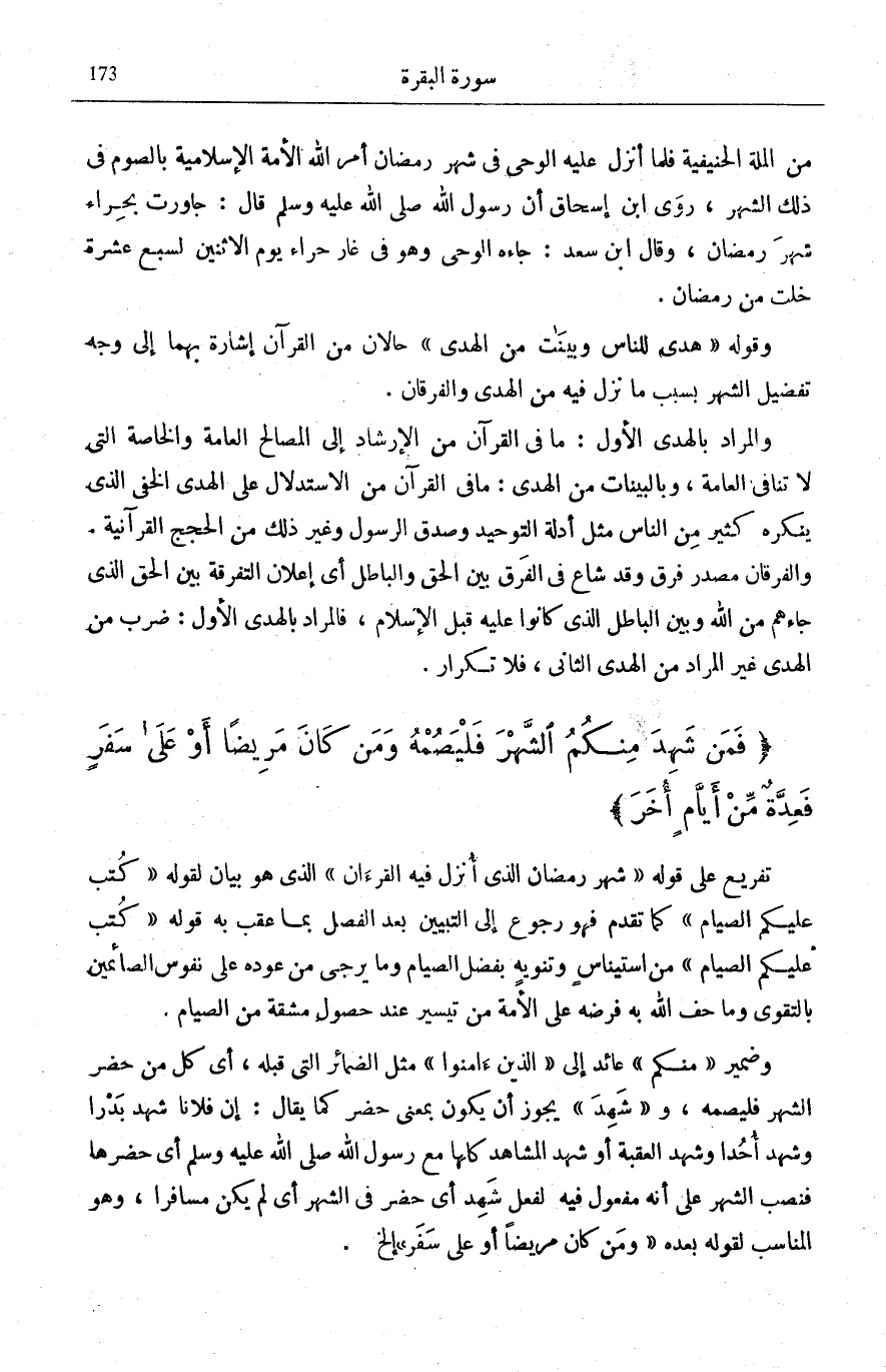 وَالْمُرَادُ بِالْهُدَى الْأَوَّلِ: مَا فِي الْقُرْآنِ مِنَ الْإِرْشَادِ إِلَى الْمَصَالِحِ الْعَامَّةِ وَالْخَاصَّةِ الَّتِي لَا تُنَافِي الْعَامَّةَ، وَبِالْبَيِّنَاتِ مِنَ الْهُدَى: مَا فِي الْقُرْآنِ مِنَ الِاسْتِدْلَالِ عَلَى الْهُدَى الْخَفِيِّ الَّذِي يُنْكِرُهُ كَثِيرٌ مِنَ النَّاسِ مِثْلَ أَدِلَّةِ التَّوْحِيدِ وَصِدْقِ الرَّسُولِ وَغَيْرِ ذَلِكَ مِنَ الْحُجَجِ الْقُرْآنِيَّةِ. وَالْفُرْقَانُ مَصْدَرُ فَرَقَ وَقَدْ شَاعَ فِي الْفَرْقِ بَيْنَ الْحَقِّ وَالْبَاطِلِ أَيْ إِعْلَانِ التَّفْرِقَةِ بَيْنَ الْحَقِّ الَّذِي جَاءَهُمْ مِنَ اللَّهِ وَبَيْنَ الْبَاطِلِ الَّذِي كَانُوا عَلَيْهِ قَبْلَ الْإِسْلَامِ، فَالْمُرَادُ بِالْهُدَى الْأَوَّلِ: ضَرْبٌ مِنَ الْهُدَى غَيْرُ الْمُرَادِ مِنَ الْهُدَى الثَّانِي، فَلَا تِكْرَارَ.