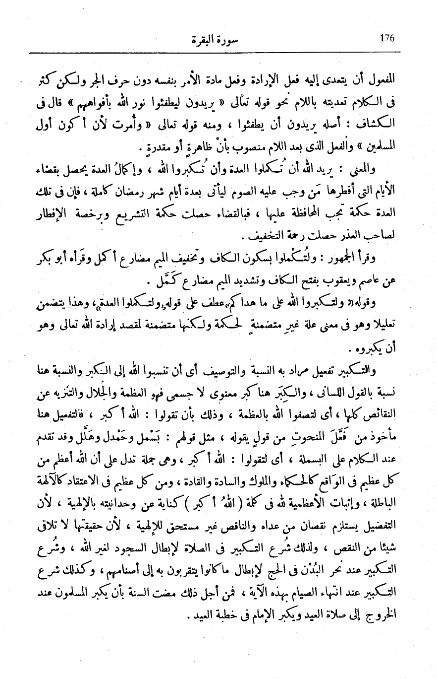 وَالتَّكْبِيرُ تَفْعِيلٌ مُرَادٌ بِهِ النِّسْبَةُ وَالتَّوْصِيفُ أَيْ أَنْ تَنْسِبُوا اللَّهَ إِلَى الْكِبَرِ وَالنِّسْبَةُ هُنَا نِسْبَةٌ بِالْقَوْلِ اللِّسَانِيِّ، وَالْكِبَرُ هُنَا كِبَرٌ مَعْنَوِيٌّ لَا جِسْمِيٌّ فَهُوَ الْعَظَمَةُ وَالْجَلَالُ وَالتَّنْزِيهُ عَنِ النَّقَائِصِ كُلِّهَا، أَيْ لِتَصِفُوا اللَّهَ بِالْعَظَمَةِ، وَذَلِكَ بِأَنْ تَقُولُوا: اللَّهُ أَكْبَرُ، فَالتَّفْعِيلُ هُنَا مَأْخُوذٌ مِنْ فِعْلٍ الْمَنْحُوتِ مِنْ قَوْلٍ يَقُولُهُ، مِثْلَ قَوْلِهِمْ: بَسْمَلَ وَحَمْدَلَ وَهَلَّلَ وَقَدْ تَقَدَّمَ عِنْدَ الْكَلَامِ عَلَى الْبَسْمَلَةِ، أَيْ لِتَقُولُوا: اللَّهُ أَكْبَرُ، وَهِيَ جُمْلَةٌ تَدُلُّ عَلَى أَنَّ اللَّهَ أَعْظَمُ مِنْ كُلِّ عَظِيمٍ فِي الْوَاقِعِ كَالْحُكَمَاءِ وَالْمُلُوكِ وَالسَّادَةِ وَالْقَادَةِ، وَمِنْ كُلِّ عَظِيمٍ فِي الِاعْتِقَادِ كَالْآلِهَةِ الْبَاطِلَةِ، وَإِثْبَاتُ الْأَعْظَمِيَّةِ لِلَّهِ فِي كَلِمَةِ (اللَّهُ أَكْبَرُ) كِنَايَةٌ عَنْ وَحْدَانِيَّتِهِ بِالْإِلَهِيَّةِ، لِأَنَّ التَّفْضِيلَ يَسْتَلْزِمُ نُقْصَانَ مَنْ عَدَاهُ وَالنَّاقِصُ غَيْرُ مُسْتَحِقٍّ لِلْإِلَهِيَّةِ، لِأَنَّ حَقِيقَتَهَا لَا تُلَاقِي شَيْئًا مِنَ النَّقْصِ، وَلِذَلِكَ شُرِعَ التَّكْبِيرُ فِي الصَّلَاة لإبطال السُّجُود لغير الله، وَشرع التَّكْبِير عِنْد نحر الْبدن فِي الْحَج لإبطال مَا كَانُوا يَتَقَرَّبُون بِهِ إِلَى أصنامهم، وَكَذَلِكَ شرع التَّكْبِيرُ عِنْدَ انْتِهَاءِ الصِّيَامِ بِهَذِهِ الْآيَةِ، فَمِنْ أَجْلِ ذَلِكَ مَضَتِ السُّنَّةُ بِأَنْ يُكَبِّرَ الْمُسْلِمُونَ عِنْدَ الْخُرُوجِ إِلَى صَلَاةِ الْعِيدِ وَيُكَبِّرَ الْإِمَامُ فِي خُطْبَةِ الْعِيدِ.