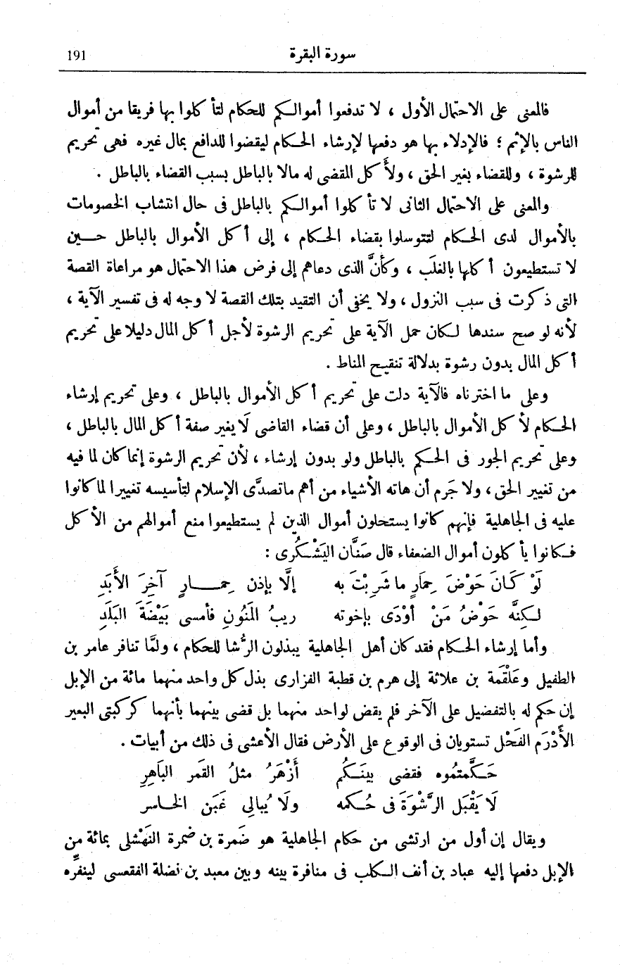 وَعَلَى مَا اخْتَرْنَاهُ فَالْآيَةُ دَلَّتْ عَلَى تَحْرِيمِ أَكْلِ الْأَمْوَالِ بِالْبَاطِلِ، وَعَلَى تَحْرِيمِ إِرْشَاءِ الْحُكَّامِ لِأَكْلِ الْأَمْوَالِ بِالْبَاطِلِ، وَعَلَى أَنَّ قَضَاءَ الْقَاضِي لَا يُغَيِّرُ صِفَةَ أَكْلِ الْمَالِ بِالْبَاطِلِ، وَعَلَى تَحْرِيمِ الْجَوْرِ فِي الْحُكْمِ بِالْبَاطِلِ وَلَوْ بِدُونِ إِرْشَاءٍ، لِأَنَّ تَحْرِيمَ الرَّشْوَةِ إِنَّمَا كَانَ لِمَا فِيهِ مِنْ تَغْيِيرِ الْحَقِّ، وَلَا جَرَمَ أَنْ هَاتِهِ الْأَشْيَاءَ مِنْ أَهَمِّ مَا تَصَدَّى الْإِسْلَامُ لِتَأْسِيسِهِ تَغْيِيرًا لِمَا كَانُوا عَلَيْهِ فِي الْجَاهِلِيَّةِ فَإِنَّهُمْ كَانُوا يَسْتَحِلُّونَ أَمْوَالَ الَّذِينَ لَمْ يَسْتَطِيعُوا مَنْعَ أَمْوَالِهِمْ مِنَ الْأَكْلِ فَكَانُوا يَأْكُلُونَ أَمْوَالَ الضُّعَفَاءِ قَالَ صَنَّانُ الْيَشْكُرِيُّ: