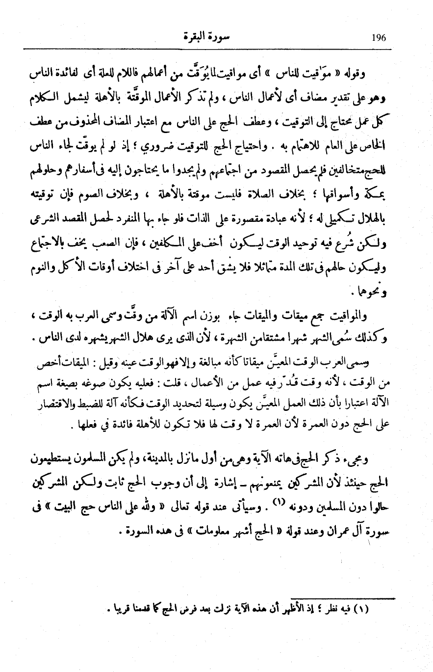 وَقَوْلُهُ: مَواقِيتُ لِلنَّاسِ أَيْ مَوَاقِيتُ لِمَا يُوَقَّتُ مِنْ أَعْمَالِهِمْ فَاللَّامُ لِلْعِلَّةِ أَيْ لِفَائِدَةِ النَّاسِ وَهُوَ عَلَى تَقْدِيرِ مُضَافٍ أَيْ لِأَعْمَالِ النَّاسِ، وَلَمْ تُذْكَرِ الْأَعْمَالُ الْمُوَقَّتَةُ بِالْأَهِلَّةِ لِيَشْمَلَ الْكَلَامُ كُلَّ عَمَلٍ مُحْتَاجٍ إِلَى التَّوْقِيتِ، وَعَطَفَ الْحَجَّ عَلَى النَّاسِ مَعَ اعْتِبَار الْمُضَاف الْمَحْذُوفِ مِنْ عَطْفِ الْخَاصِّ عَلَى الْعَامِّ لِلِاهْتِمَامِ بِهِ وَاحْتِيَاجُ الْحَجِّ لِلتَّوْقِيتِ ضَرُورِيٌّ إِذْ