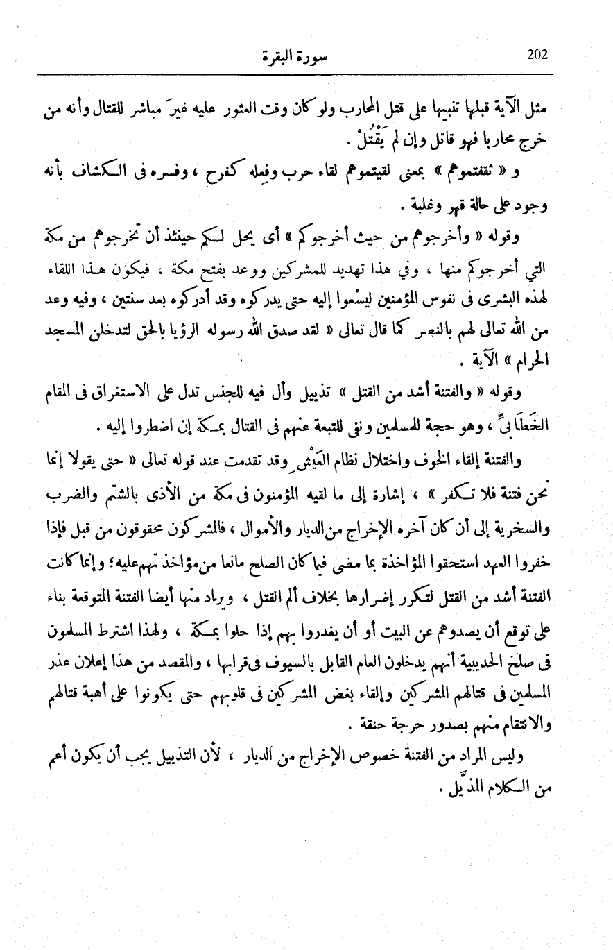وَقَوْلُهُ: وَالْفِتْنَةُ أَشَدُّ مِنَ الْقَتْلِ تَذْيِيلٌ وأل فِيهِ لِلْجِنْسِ تَدُلُّ عَلَى الِاسْتِغْرَاقِ فِي الْمَقَامِ الْخِطَابِيِّ، وَهُوَ حُجَّةٌ لِلْمُسْلِمِينَ وَنَفْيٌ لِلتَّبِعَةِ عَنْهُمْ فِي الْقِتَالِ بِمَكَّةَ إِنِ اضْطُرُّوا إِلَيْهِ.