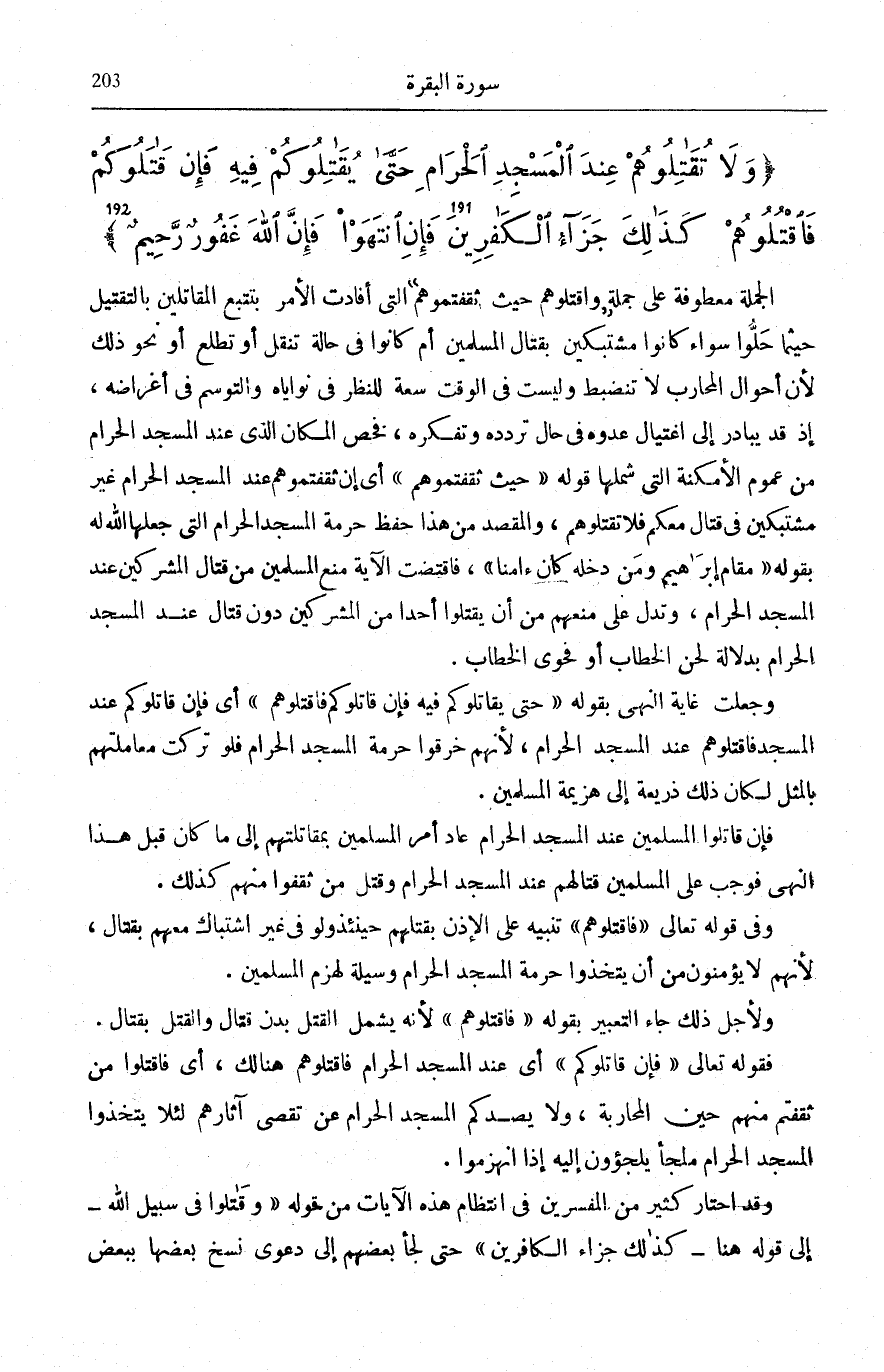 الْجُمْلَةُ مَعْطُوفَةٌ عَلَى جُمْلَةِ وَاقْتُلُوهُمْ حَيْثُ ثَقِفْتُمُوهُمْ الَّتِي أَفَادَتِ الْأَمْرَ بِتَتَبُّعِ الْمُقَاتِلِينَ بِالتَّقْتِيلِ حَيْثُمَا حَلُّوا سَوَاءٌ كَانُوا مُشْتَبِكِينَ بِقِتَالِ الْمُسْلِمِينَ أَمْ كَانُوا فِي حَالَةِ تَنَقُّلٍ أَوْ تَطَلُّعٍ أَوْ نَحْوِ ذَلِكَ لِأَنَّ أَحْوَالَ الْمُحَارِبِ لَا تَنْضَبِطُ وَلَيْسَتْ فِي الْوَقْتِ سَعَةٌ لِلنَّظَرِ فِي نَوَايَاهُ وَالتَّوَسُّمِ فِي أَغْرَاضِهِ، إِذْ قد يبادره إِلَى اغْتِيَالِ عَدُوِّهِ فِي حَالِ تَرَدُدِّهِ وَتَفَكُّرِهِ، فَخَصَّ الْمَكَانَ الَّذِي عِنْدَ الْمَسْجِدِ الْحَرَامِ مِنْ عُمُومِ الْأَمْكِنَةِ الَّتِي شَمِلَهَا قَوْلُهُ: حَيْثُ ثَقِفْتُمُوهُمْ أَيْ إِنْ ثَقِفْتُمُوهُمْ عِنْدَ الْمَسْجِدِ الْحَرَامِ غَيْرَ مُشْتَبِكِينَ فِي قِتَالٍ مَعَكُمْ فَلَا تَقْتُلُوهُمْ، وَالْمَقْصِدُ مِنْ هَذَا حِفْظُ حُرْمَةِ الْمَسْجِدِ الْحَرَامِ الَّتِي جَعَلَهَا اللَّهُ لَهُ بِقَوْلِهِ: مَقامُ إِبْراهِيمَ وَمَنْ دَخَلَهُ كانَ آمِناً [آل عمرَان: 97] ، فَاقْتَضَتِ الْآيَةُ مَنْعَ الْمُسْلِمِينَ مِنْ قِتَالِ الْمُشْرِكِينَ عِنْدَ الْمَسْجِدِ الْحَرَامِ، وَتَدُلُّ عَلَى مَنْعِهِمْ مِنْ أَنْ يَقْتُلُوا أَحَدًا مِنَ الْمُشْرِكِينَ دُونَ قِتَالٍ عِنْدَ الْمَسْجِدِ الْحَرَامِ