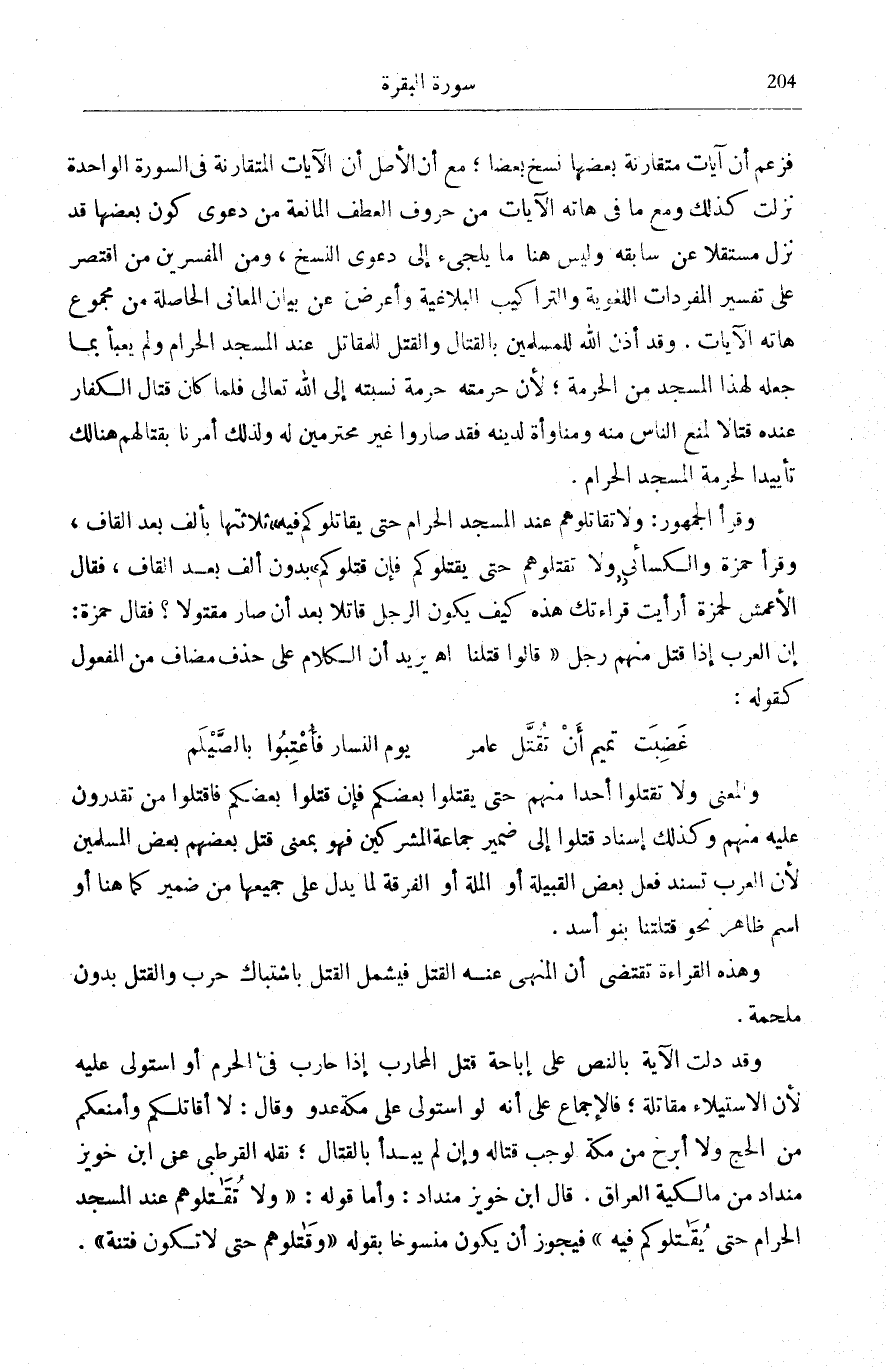 وَقَدْ أَذِنَ اللَّهُ لِلْمُسْلِمِينَ بِالْقِتَالِ وَالْقَتْلِ لِلْمُقَاتِلِ عِنْدَ الْمَسْجِدِ الْحَرَامِ وَلَمْ يَعْبَأْ بِمَا جَعَلَهُ لِهَذَا الْمَسْجِدِ مِنَ الْحُرْمَةِ لِأَنَّ حُرْمَتَهُ حُرْمَةُ نِسْبَتِهِ إِلَى اللَّهِ تَعَالَى فَلَمَّا كَانَ قِتَالُ الْكُفَّارِ عِنْدَهُ قِتَالًا لِمَنْعِ النَّاسِ مِنْهُ وَمُنَاوَاةً لِدِينِهِ فَقَدْ صَارُوا غَيْرَ مُحْتَرِمِينَ لَهُ وَلِذَلِكَ أَمَرَنَا بِقِتَالِهِمْ هُنَالِكَ تَأْيِيدًا لِحُرْمَةِ الْمَسْجِدِ الْحَرَامِ.