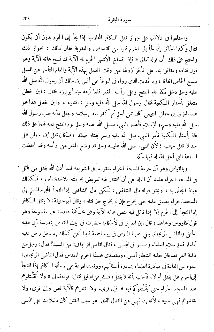 وَاخْتَلَفُوا فِي دَلَالَتِهَا عَلَى جَوَازِ قَتْلِ الْكَافِرِ الْمُحَارِبِ إِذَا لَجَأَ إِلَى الْحَرَمِ بِدُونِ أَنْ يَكُونَ قِتَالٌ وَكَذَا الْجَانِي إِذَا لَجَأَ إِلَى الْحَرَمِ فَارًّا مِنَ الْقِصَاصِ وَالْعُقُوبَةِ فَقَالَ مَالِكٌ: بِجَوَازِ ذَلِكَ وَاحْتَجَّ عَلَى ذَلِكَ بِأَنَّ قَوْلَهُ تَعَالَى: فَإِذَا انْسَلَخَ الْأَشْهُرُ الْحُرُمُ [التَّوْبَة: 5] الْآيَةَ قَدْ نَسَخَ هَاتِهِ الْآيَةَ وَهُوَ قَوْلُ قَتَادَةَ وَمُقَاتِلٍ بِنَاءً عَلَى تَأَخُّرِ نُزُولِهَا عَنْ وَقْتِ الْعَمَلِ بِهَذِهِ الْآيَةِ وَالْعَامُّ الْمُتَأَخِّرُ عَنِ الْعَمَلِ يَنْسَخُ الْخَاصَّ اتِّفَاقًا.