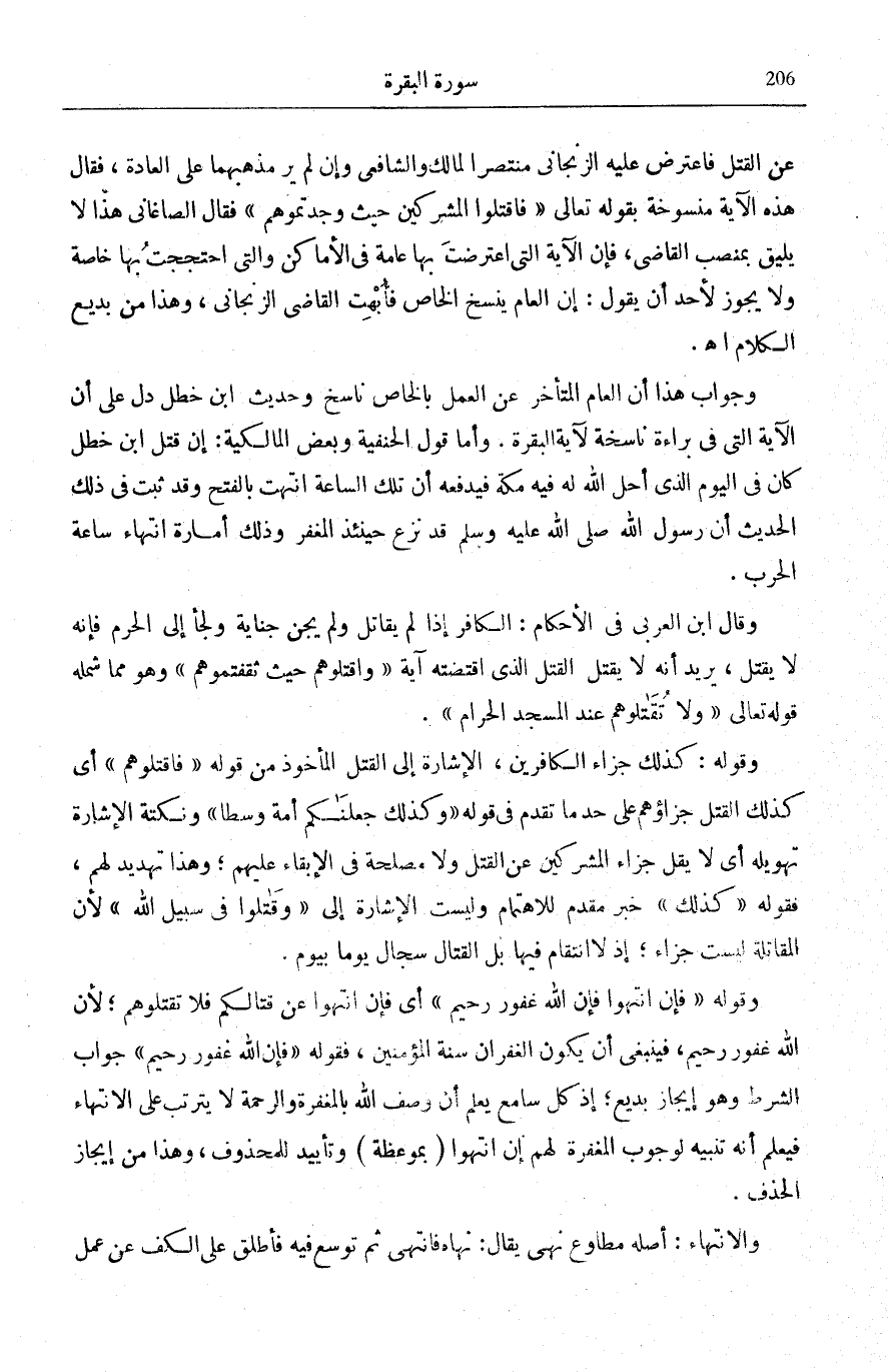 عَنِ الْقَتْلِ فَاعْتَرَضَ عَلَيْهِ الزِّنْجَانِيُّ مُنْتَصِرًا لِمَالِكٍ وَالشَّافِعِيِّ وَإِنْ لَمْ يَرَ مَذْهَبَهُمَا عَلَى الْعَادَةِ، فَقَالَ هَذِهِ الْآيَةُ مَنْسُوخَةٌ بِقَوْلِهِ تَعَالَى: فَاقْتُلُوا الْمُشْرِكِينَ حَيْثُ وَجَدْتُمُوهُمْ [التَّوْبَة: 5] فَقَالَ الصَّاغَانِيُّ هَذَا لَا يَلِيقُ بِمَنْصِبِ الْقَاضِي، فَإِنَّ الْآيَةَ الَّتِي اعْتَرَضْتَ بِهَا عَامَّةٌ فِي الْأَمَاكِنِ وَالَّتِي احْتَجَجْتُ بِهَا خَاصَّةٌ وَلَا يَجُوزُ لِأَحَدٍ أَنْ يَقُولَ: إِنَّ الْعَامَّ يَنْسَخُ الْخَاصَّ فَأُبْهِتَ الْقَاضِي الزِّنْجَانِيُّ، وَهَذَا مِنْ بديع الْكَلَام اهـ.