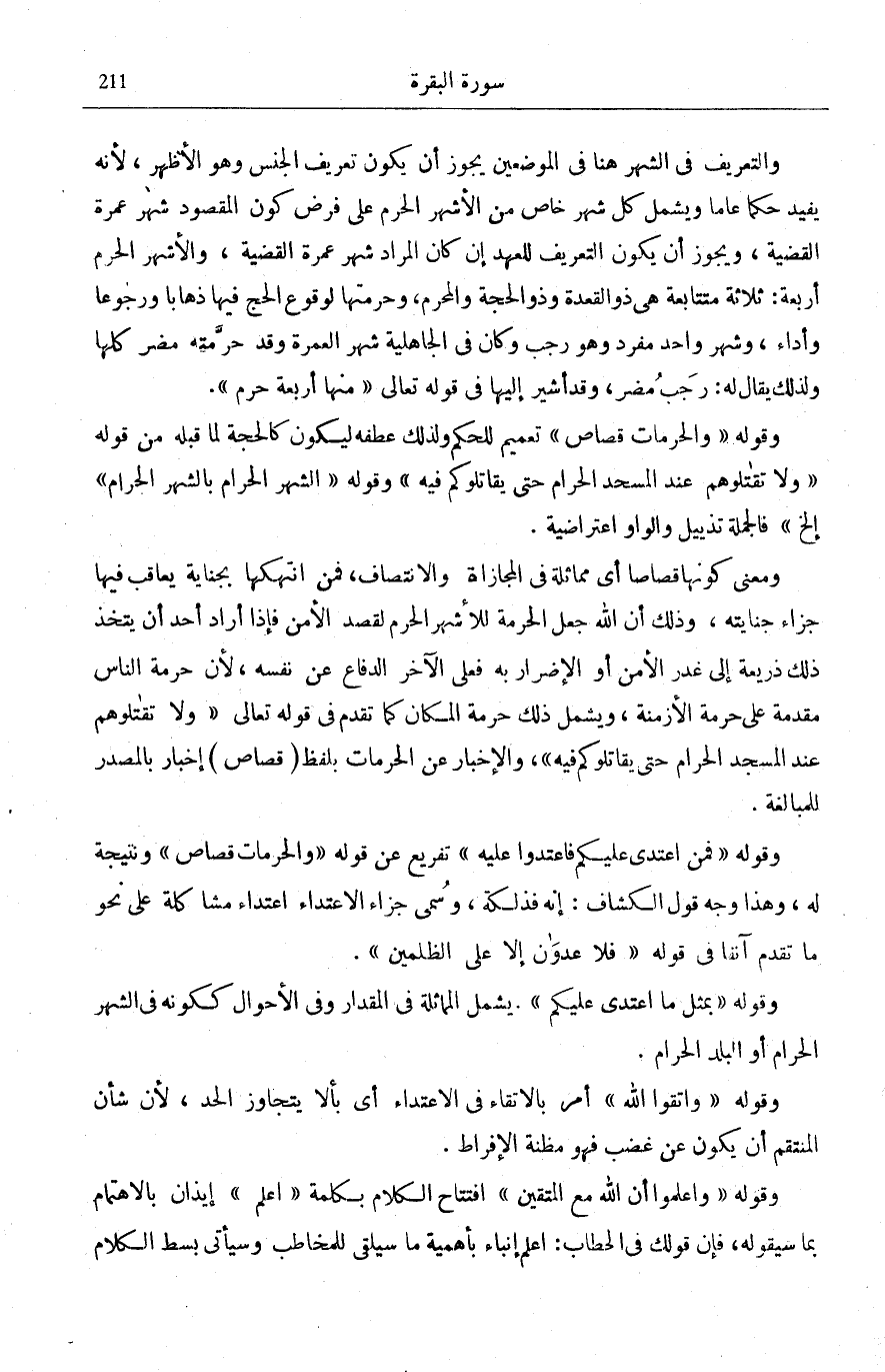 الشَّهْرُ الْحَرامُ بِالشَّهْرِ الْحَرامِ إِلَخ، فالجملة تذييل وَالْوَاو اعتراضية. وَمَعْنَى كَوْنِهَا قِصَاصًا أَيْ مُمَاثِلَةً فِي الْمُجَازَاةِ وَالِانْتِصَافِ، فَمَنِ انْتَهَكَهَا بِجِنَايَةٍ يُعَاقَبُ فِيهَا جَزَاءَ جِنَايَتِهِ، وَذَلِكَ أَنَّ اللَّهَ جَعَلَ الْحُرْمَةَ لِلْأَشْهُرِ الْحُرُمِ لِقَصْدِ الْأَمْنِ فَإِذَا أَرَادَ أَحَدٌ أَنْ يَتَّخِذَ ذَلِكَ ذَرِيعَةً إِلَى غَدْرِ الْأَمْنِ أَوِ الْإِضْرَارِ بِهِ فَعَلَى الْآخَرِ الدِّفَاعُ عَنْ نَفْسِهِ، لِأَنَّ حُرْمَةَ النَّاسِ مُقَدَّمَةٌ عَلَى حُرْمَةِ الْأَزْمِنَةِ، وَيَشْمَلُ ذَلِكَ حُرْمَةَ الْمَكَانِ كَمَا تَقَدَّمَ فِي قَوْلِهِ تَعَالَى: وَلا تُقاتِلُوهُمْ عِنْدَ الْمَسْجِدِ الْحَرامِ حَتَّى يُقاتِلُوكُمْ فِيهِ [الْبَقَرَة: 191] ، وَالْإِخْبَارُ عَنِ الْحُرُمَاتِ بِلَفْظِ (قِصَاصٍ) إِخْبَارٌ بِالْمَصْدَرِ لِلْمُبَالَغَةِ.