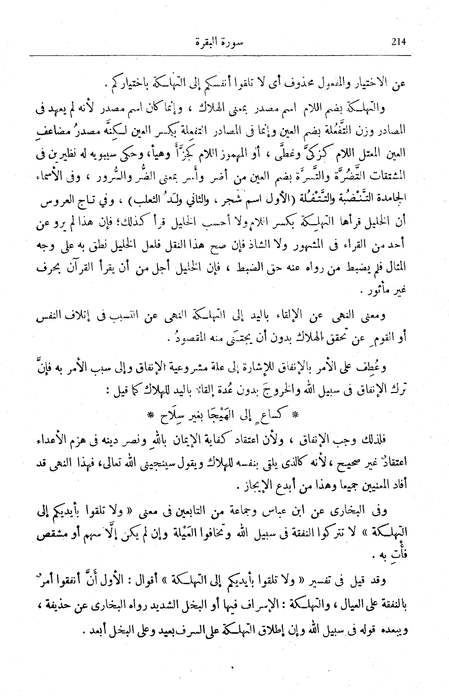 الْأَوَّلُ أَنَّ أَنْفِقُوا أَمْرٌ بِالنَّفَقَةِ عَلَى الْعِيَالِ، والتهلكة: الْإِسْرَافُ فِيهَا أَوِ الْبُخْلُ الشَّدِيدُ رَوَاهُ الْبُخَارِيُّ عَنْ حُذَيْفَةَ، وَيُبْعِدُهُ قَوْلُهُ فِي سَبِيلِ اللَّهِ وَأَنَّ إِطْلَاقَ التَّهْلُكَةِ عَلَى السَّرَفِ بَعِيدٌ وَعَلَى الْبُخْلِ أَبْعَدُ.