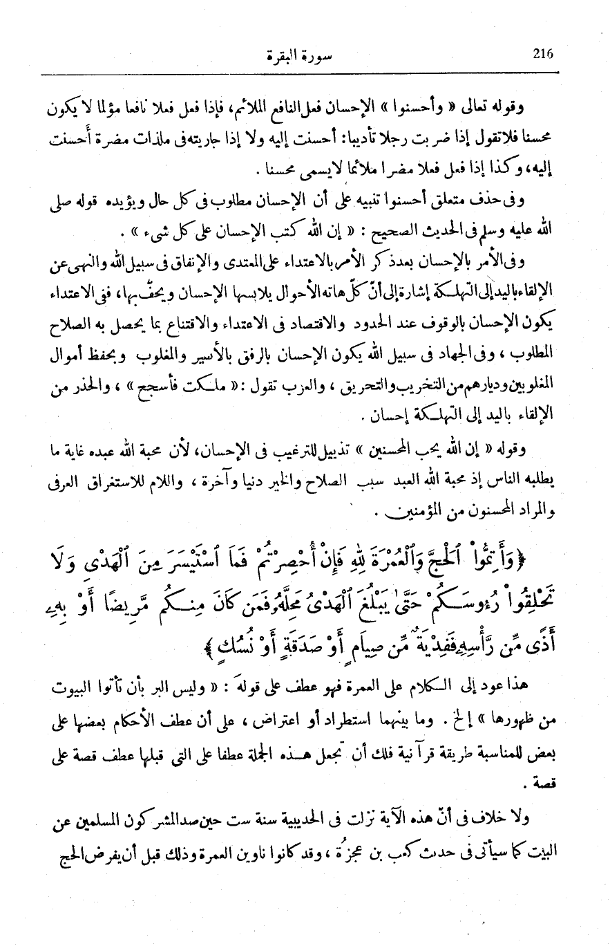 هَذَا عَوْدٌ إِلَى الْكَلَامِ عَلَى الْعُمْرَةِ فَهُوَ عَطْفٌ عَلَى قَوْلِهِ: وَلَيْسَ الْبِرُّ بِأَنْ تَأْتُوا الْبُيُوتَ مِنْ ظُهُورِها [الْبَقَرَة: 189] إِلَخْ وَمَا بَيْنَهُمَا اسْتِطْرَادٌ أَوِ اعْتِرَاضٌ، عَلَى أَنَّ عَطْفَ الْأَحْكَامِ بَعْضِهَا عَلَى بَعْضٍ لِلْمُنَاسَبَةِ طَرِيقَةٌ قُرْآنِيَّةٌ فَلَكَ أَنْ تَجْعَلَ هَذِهِ الْجُمْلَةَ عَطْفًا عَلَى الَّتِي قَبْلَهَا عَطْفَ قِصَّةٍ عَلَى قِصَّةٍ.