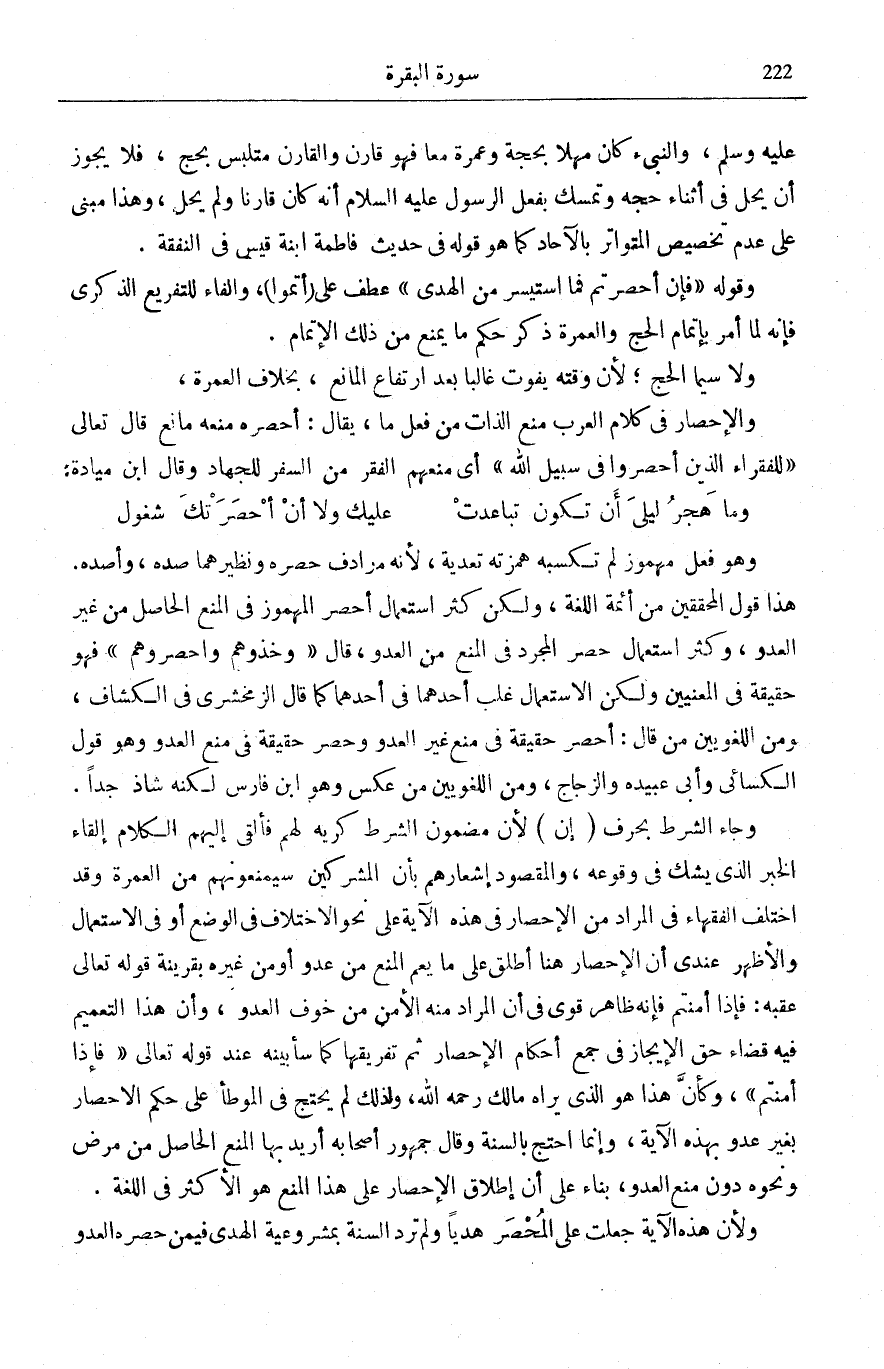 وَقَدِ اخْتَلَفَ الْفُقَهَاءُ فِي الْمُرَادِ مِنَ الْإِحْصَارِ فِي هَذِهِ الْآيَةِ عَلَى نَحْوِ الِاخْتِلَافِ فِي الْوَضْعِ أَوْ فِي الِاسْتِعْمَالِ وَالْأَظْهَرُ عِنْدِي أَنَّ الْإِحْصَارَ هُنَا أُطْلِقَ عَلَى مَا يَعُمُّ الْمَنْعَ مِنْ عَدُوٍّ أَوْ مِنْ غَيْرِهِ بِقَرِينَةِ قَوْلِهِ تَعَالَى عَقِبَهُ: فَإِذا أَمِنْتُمْ فَإِنَّهُ ظَاهِرٌ قَوِيٌّ فِي أَنَّ الْمُرَادَ مِنْهُ الْأَمْنُ مِنْ خَوْفِ الْعَدُوِّ، وَأَنَّ هَذَا التَّعْمِيمَ فِيهِ قَضَاءُ حَقِّ الْإِيجَازِ فِي جَمْعِ أَحْكَامِ الْإِحْصَارِ ثُمَّ تَفْرِيقِهَا كَمَا سَأُبَيِّنُهُ عِنْدَ قَوْلِهِ تَعَالَى: فَإِذا أَمِنْتُمْ، وَكَأَنَّ هَذَا هُوَ الَّذِي يَرَاهُ مَالِكٌ رَحِمَهُ اللَّهُ، وَلِذَلِكَ لَمْ يَحْتَجَّ فِي «الْمُوَطَّأِ» عَلَى حُكْمِ الْإِحْصَارِ بِغَيْرِ عَدُوٍّ بِهَذِهِ الْآيَةِ، وَإِنَّمَا